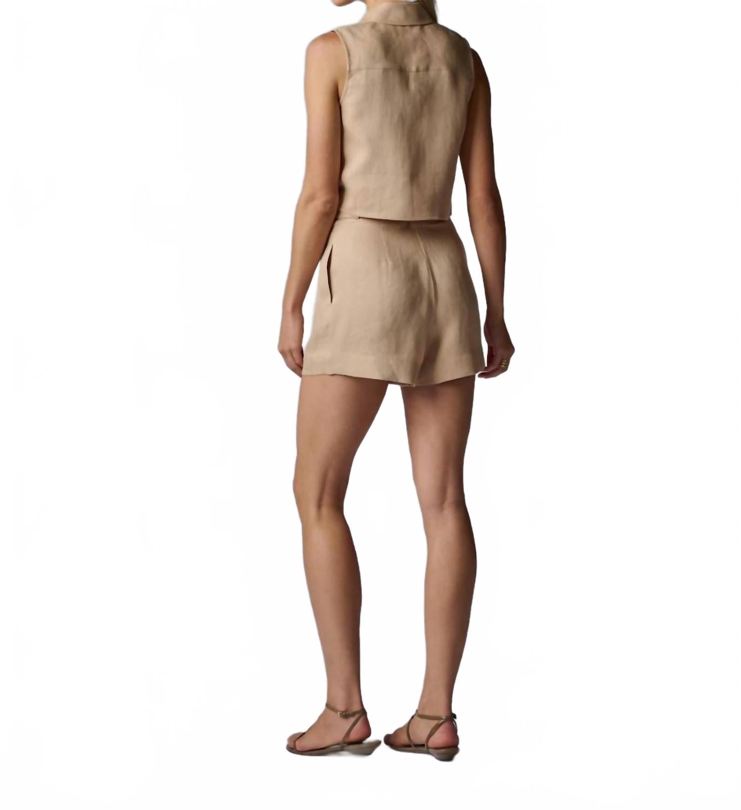 Сочетайте этот укороченный топ с любимыми джинсами с высокой талией или макси-юбкой. Откройте для себя топ Katja Top от Hevron - минималистичную модель из 100% льна однотонного пшеничного оттенка. Этот женский укороченный топ без рукавов, слегка приталенный, с отложным воротником и удобной застежкой на пуговицы по центру спереди. Идеальный вариант для весны, этот топ обеспечивает максимальный комфорт и легко сочетается с вашим гардеробом для отпуска. Чтобы сохранить его естественную элегантность, обратитесь в химчистку.