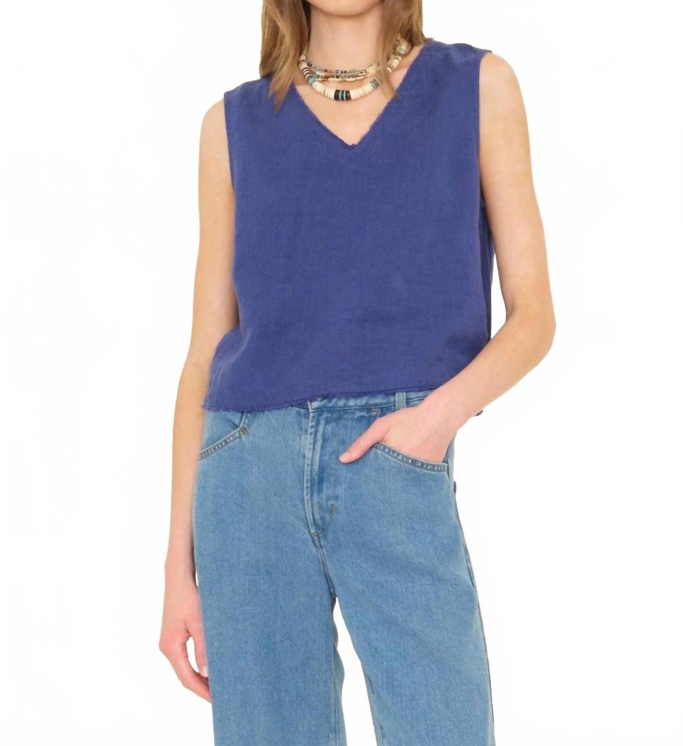 Идеальный укороченный топ для теплой погоды. Представляем женский топ Zadig от XIRENA - стильный укороченный топ в синем цвете, идеально подходящий для летнего отдыха. Этот однотонный топ из легкого льна без рукавов с V-образным вырезом, необработанными краями на горловине и подоле, а также застежкой-капелькой на пуговицы сзади. Благодаря застежке-липучке этот топ гармонично сочетает в себе комфорт и стильный уличный стиль. Наслаждайтесь идеальной посадкой по фигуре и создайте модный и непринужденный образ.