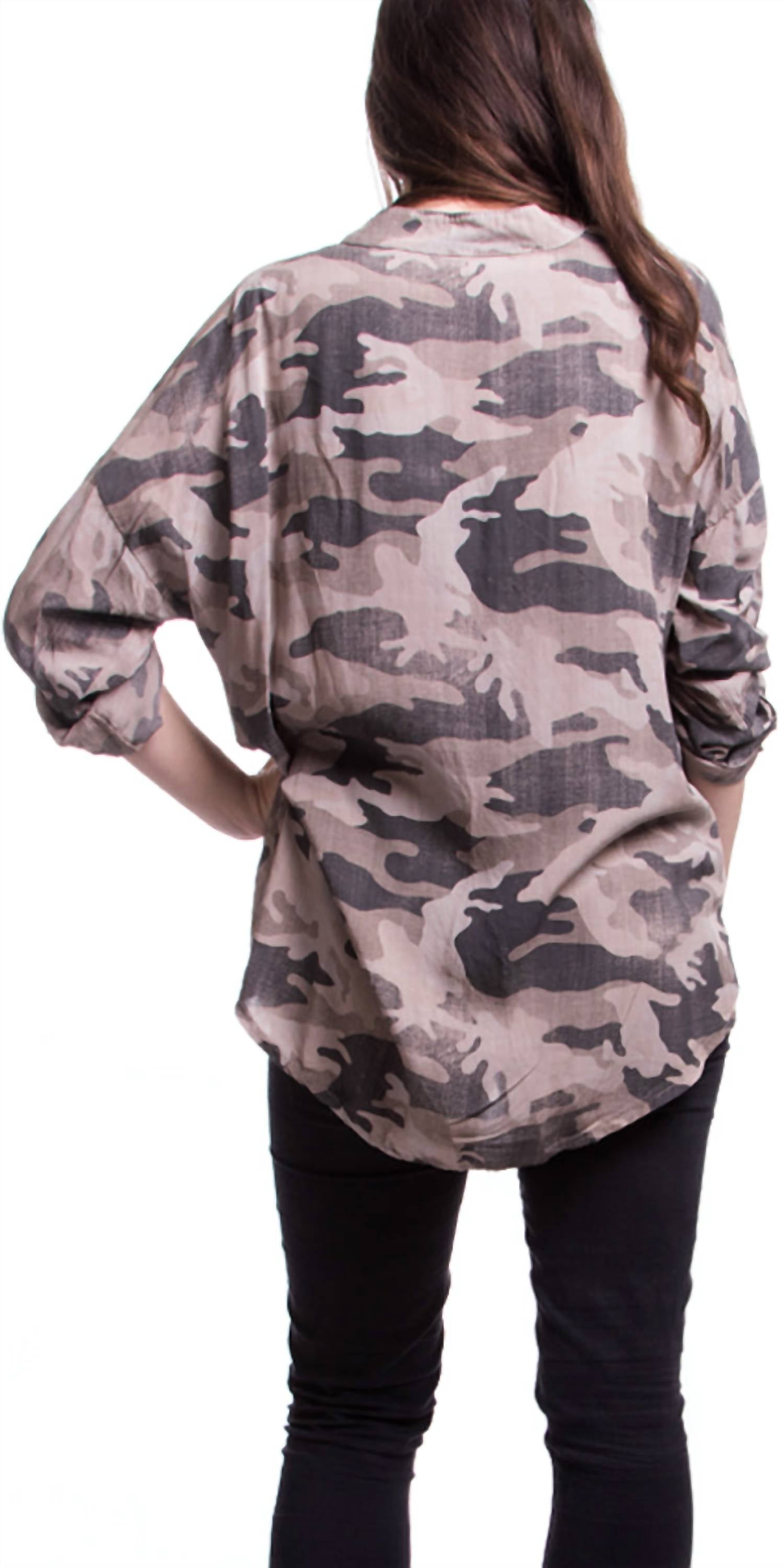 Универсальная блузка, которая подойдет и для работы, и для ужина! Представляем топ Leona Button Top от GIGI MODA - шикарный выбор на весну и идеально подходит для путешествий. Эта блузка с узором имеет манжеты длиной три четверти и воротник на пуговицах. Камуфляжный принт и пайетки добавляют ей изысканности. Изготовлена ​​из 100% вискозы, обеспечивает дышащую и комфортную посадку. Сделано в Италии. Застежка: планка с пуговицами. Уход: ручная стирка и сушка на веревке для достижения наилучшего результата.
