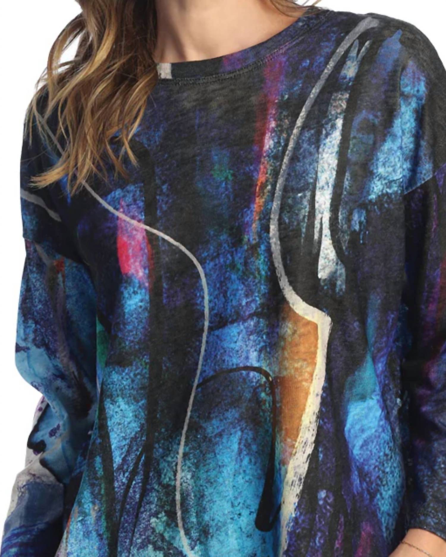 Универсальная блузка, которая подойдет и для работы, и для ужина! Встречайте легкий трикотажный топ Jess & Jane Eclipse со ступенчатым подолом - незаменимая вещь в вашем весеннем гардеробе. Этот топ с длинными рукавами изготовлен из 100% полиэстера и украшен красивым абстрактным принтом в ярких разноцветных тонах. Изготовлен в США. Круглый вырез горловины и стильный ступенчатый подолом создают современный образ. Застежка: надевается вручную. Уход: машинная стирка в холодной воде на щадящем режиме.