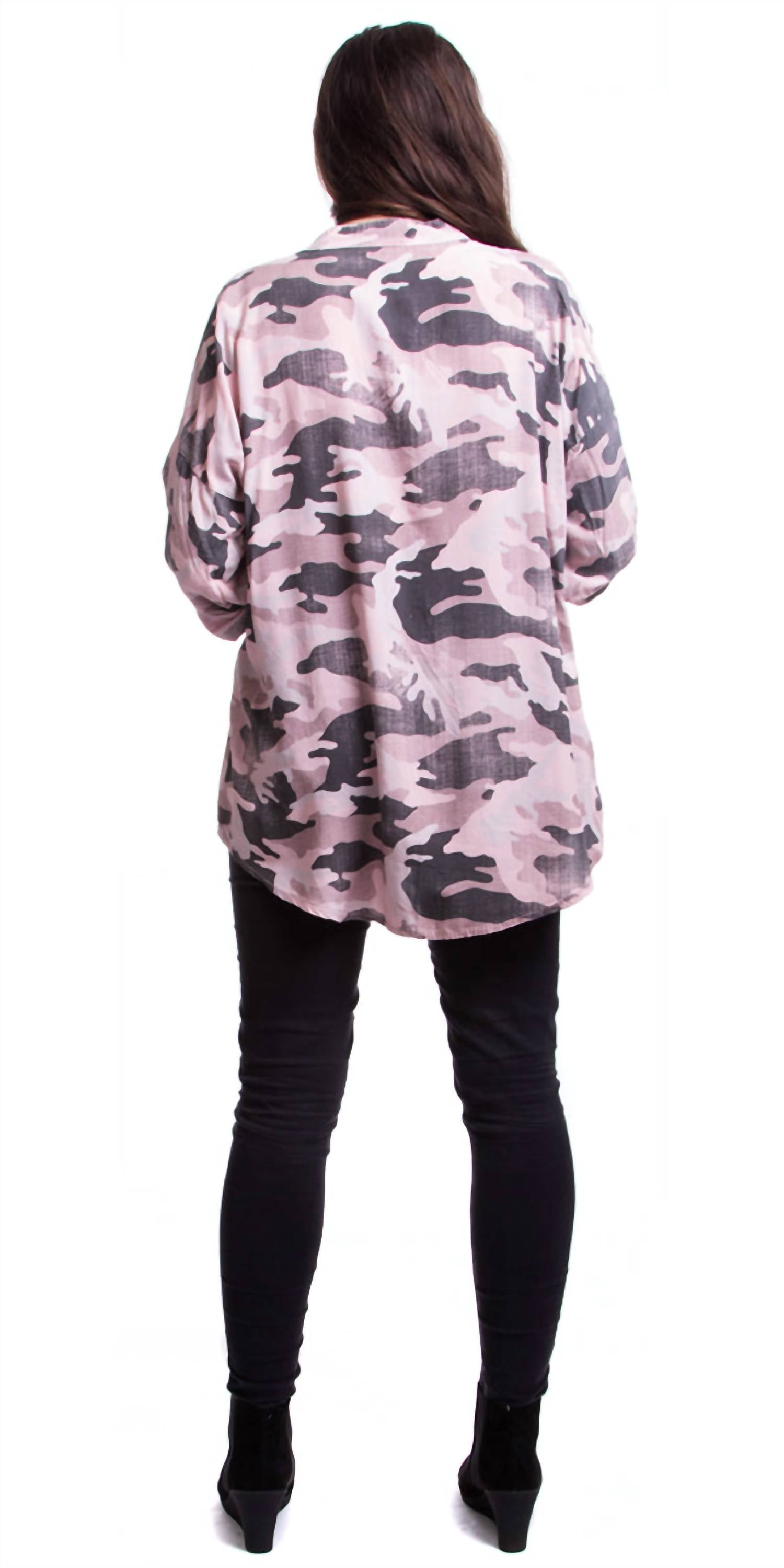 Универсальная блузка, которая подойдет как для работы, так и для ужина! Топ Leona Button от GIGI MODA с шикарным розовым камуфляжным узором идеально подойдет как для работы, так и для праздников. Рукава с манжетами три четверти и карманы с пайетками создают стильный образ, а воротник на пуговицах создает изысканный образ. Изготовлена ​​из 100% вискозы в Италии, она обеспечивает комфорт и элегантность. Застежка: пуговицы. Уход: ручная стирка, сушка на веревке. Доступен в одном размере.