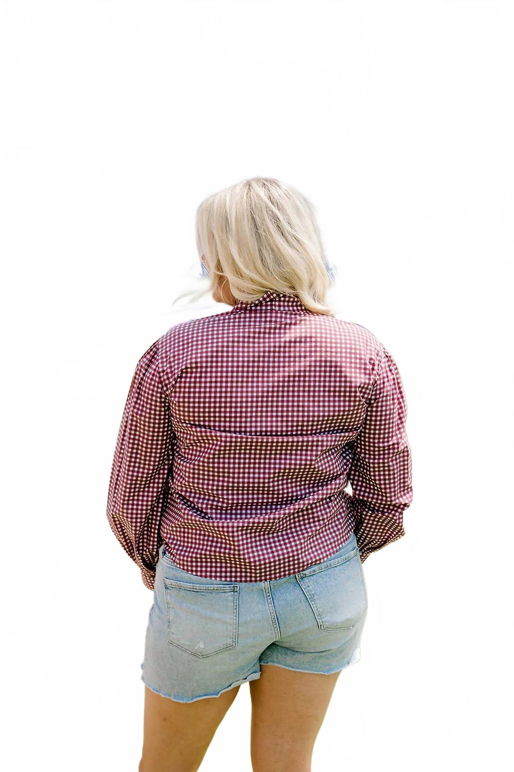 Идеально сшитый и мягкий на ощупь. Дополните свой гардероб стильным топом Sadie Gingham от Layerz Clothing в бордово-белую клетку, идеально подходящим для весенних помолвок и прогулок в День святого Валентина. Этот топ с длинными рукавами и очаровательным воротником-бабочкой выполнен из 100% хлопка для комфорта и воздухопроницаемости. Застежка: пуговицы. Уход: ручная стирка в холодной воде и сушка на веревке. Сочетайте с джинсами для создания элегантного образа.