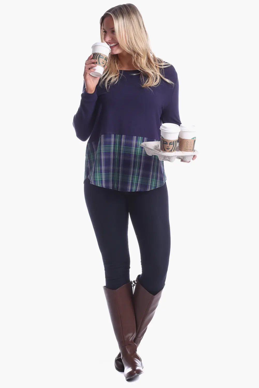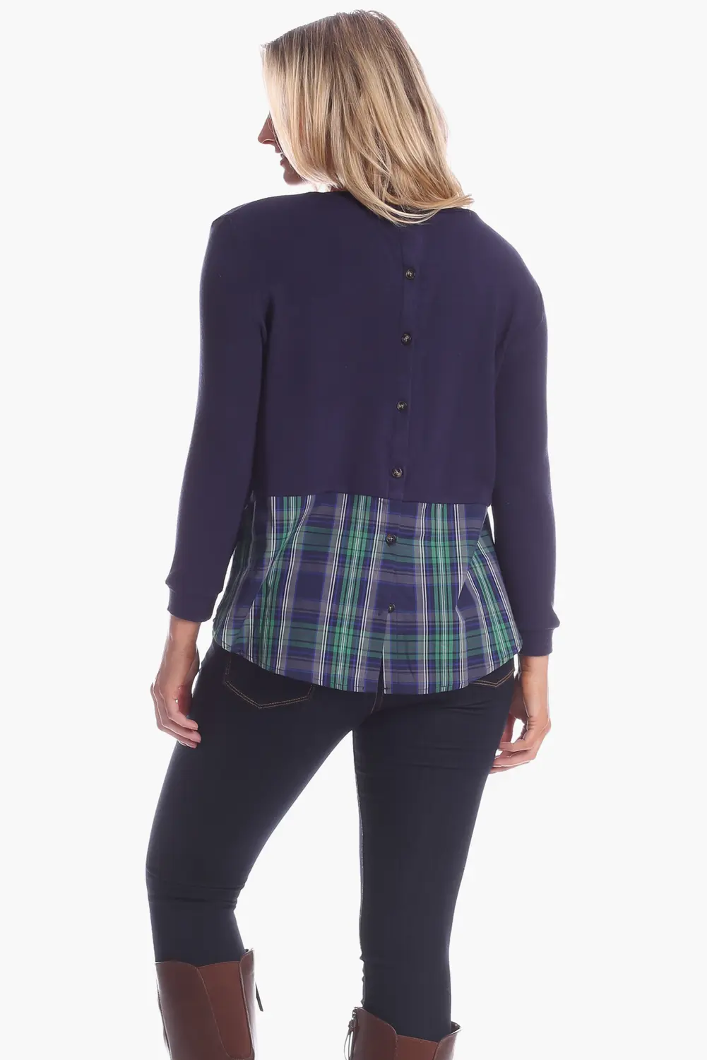 Топ Allison - это комбинированный топ с пуговицами на спине. Свободный крой и удобный, но при этом изысканный стиль делают его идеальным для работы из дома! Подробности: темно-синий трикотаж с темно-сине-зеленой клеткой. Свободный крой. Застежка на пуговицы на спине. Закругленный низ. Материал: трикотаж: 94% акрил, 6% спандекс. Клетчатая ткань: 100% хлопок. Инструкции по уходу: стирать в холодной воде, сушить на открытом воздухе.