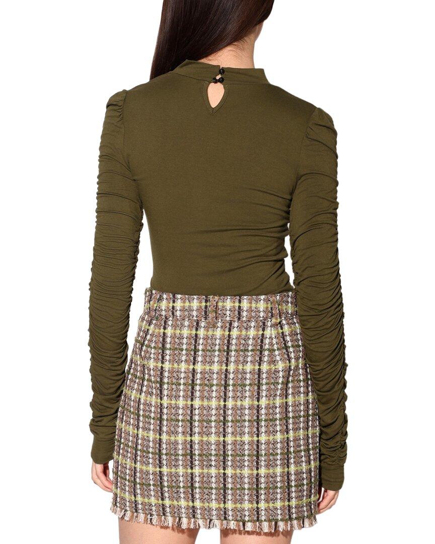 Представляем топ Walter Baker Chaya - незаменимое дополнение к гардеробу любой стильной женщины. Этот топ воплощает энергичный, эклектичный и смелый стиль, характерный для бренда Walter Baker. Топ Chaya оливкового цвета имеет облегающий крой и длинные рукава со сборками и эластичной внутренней частью для комфортной посадки. Длинные манжеты и застежка на пуговицу сзади и петлю над разрезом придают этому универсальному топу изысканность. Топ Chaya, изготовленный из смеси 95% вискозы и 5% спандекса, легко поддается уходу и достаточно стирать вручную. Этот импортный топ длиной около 56 см от плеча до подола станет идеальным выбором для любого случая.