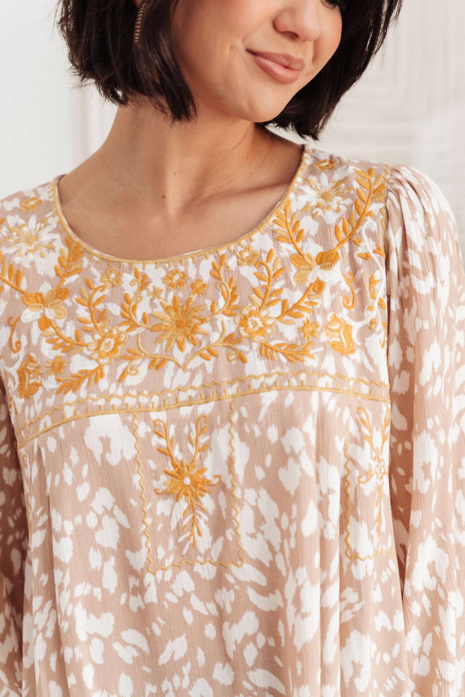 Универсальная блузка, которая подойдет как для работы, так и для ужина! Дополните свой гардероб в стиле бохо-шик топом Take Me Anywhere от Hailey & Co с эффектной оранжевой вышивкой на фоне нежного анималистичного принта. Эта легкая блузка с длинными рукавами имеет рукава-фонарики с эластичными манжетами и удобной застежкой на пуговицы сзади. Топ из 100% вискозы обеспечивает свободный крой и длину изделия 66 см, обеспечивая комфорт и стильный вид. Уход прост: машинная стирка в холодной воде и сушка на вертеле. Модель Сабрина носит размер S, а модель Амелия - 1XL.
