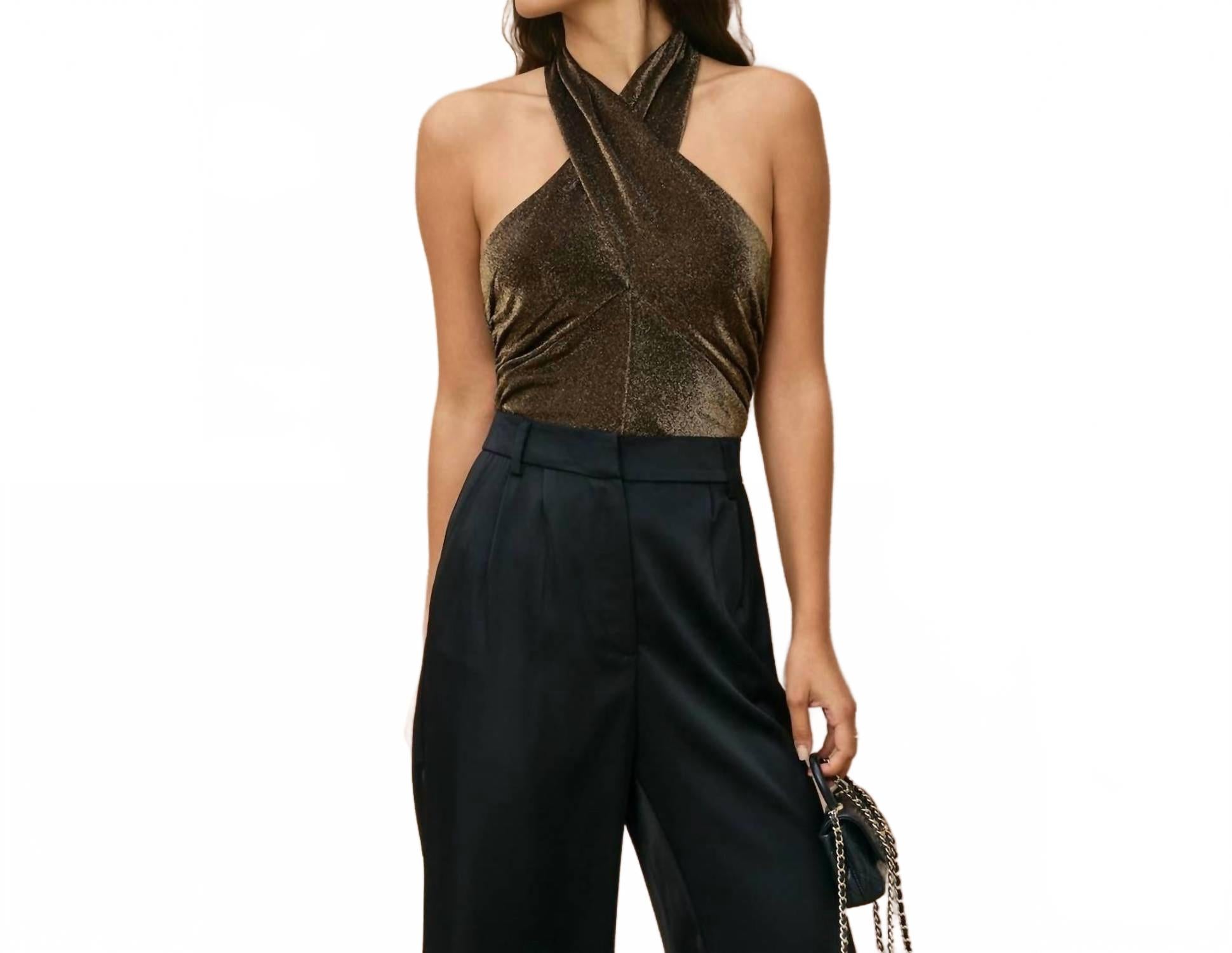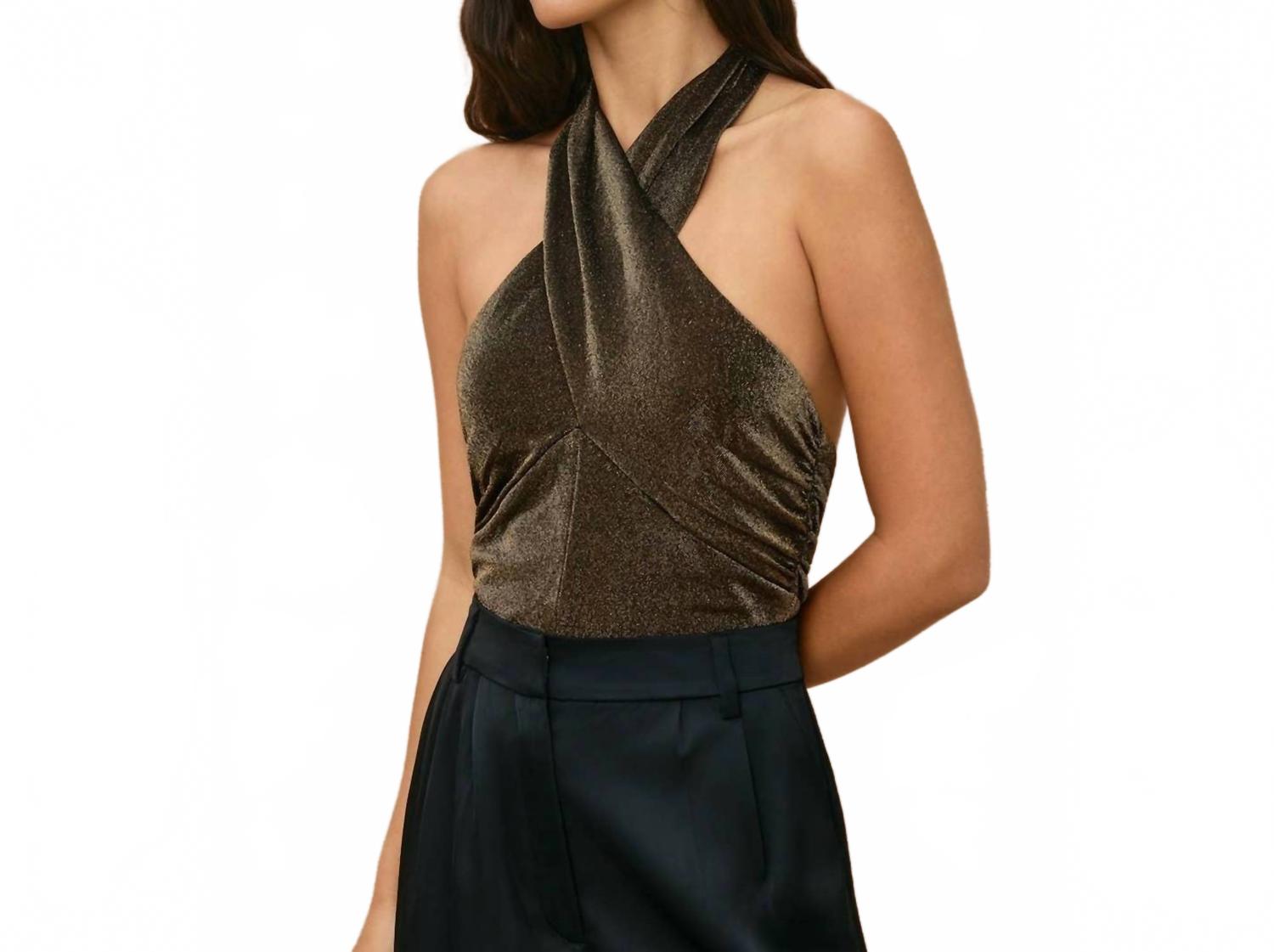 Украсьте свой праздничный образ боди Vanessa Halter от DRESS FORUM с мерцающей золотистой текстурированной отделкой. Эта модель без рукавов отличается элегантным перекрещивающимся халтером с вырезом-замочной скважиной и открытой спиной для дополнительной привлекательности. Изготовлено из эластичного нейлона с металлическим отливом и полностью на подкладке для идеальной посадки. Застежка: кнопка. Уход: ручная стирка и сушка на веревке. Модели ростом 175 см (175 см) носят размер S. Верхний слой: 65% нейлон, 35% металлик, подкладка: 92% полиэстер, 8% спандекс.