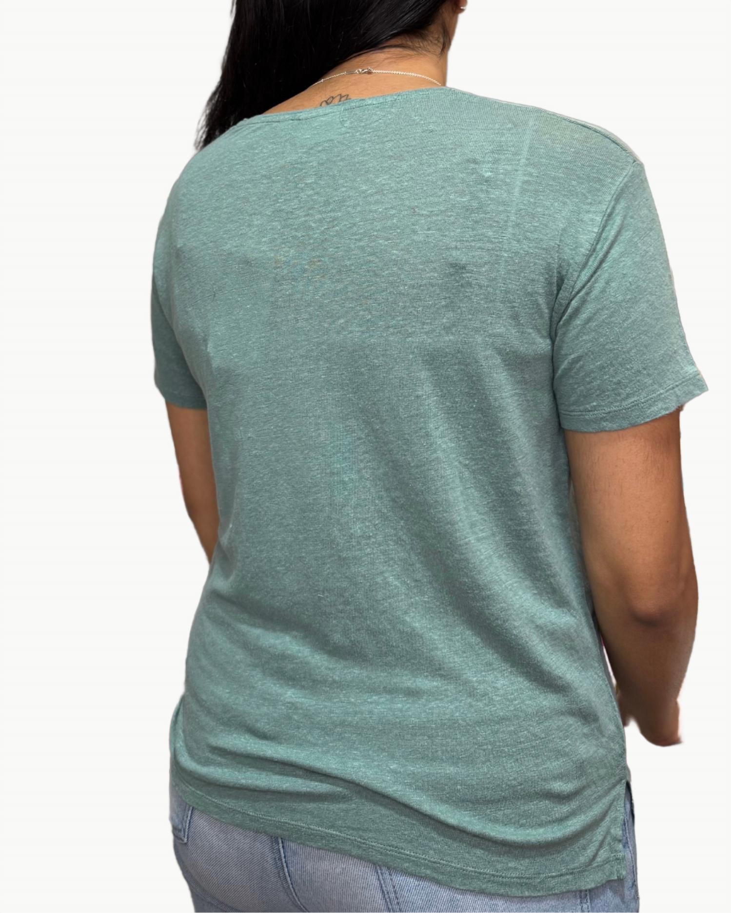 Не ищите дальше - вы нашли свою идеальную футболку! Откройте для себя футболку Torama Knit от Hartford - минималистичный летний аксессуар в нежно-зеленом оттенке агавы. Эта футболка с короткими рукавами изготовлена ​​из 100% льна, дышащего и легкого трикотажа, идеально подходящего для весенних случаев. Мягкий V-образный вырез и свободный крой обеспечивают легкость и комфорт при ношении. Застежка - надевается. Рост модели 160 см, размер 0.