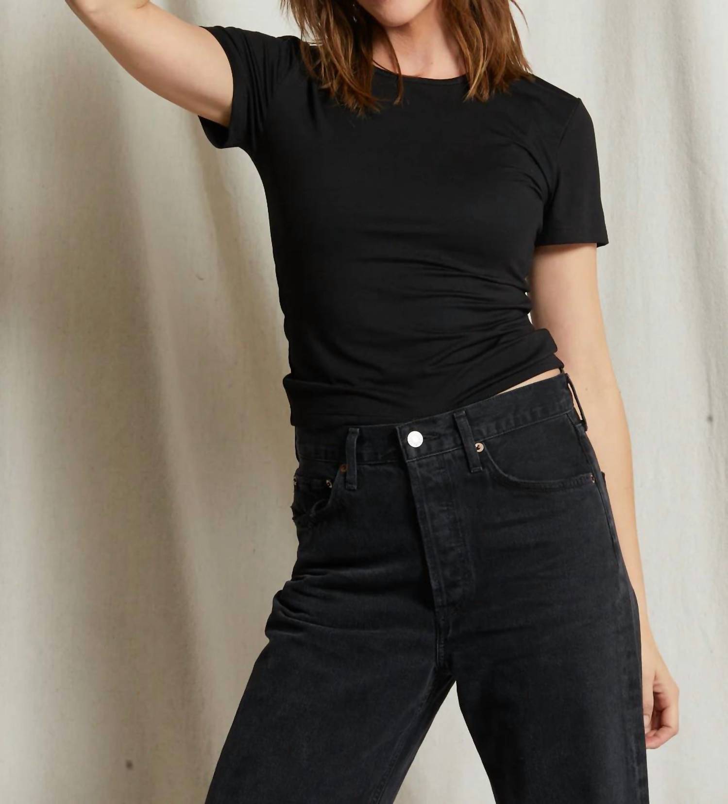 Эта облегающая футболка с короткими рукавами и круглым вырезом выполнена из гладкой смеси 84% хлопка и 16% спандекса. Футболка рассчитана на ношение в полную длину, ее можно носить как в сочетании с другими вещами, так и отдельно. Футболка с гордостью производится в Калифорнии. Застежка: надевайте. Машинная стирка, сушка в стиральной машине.