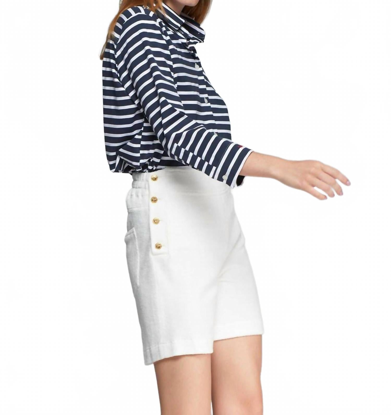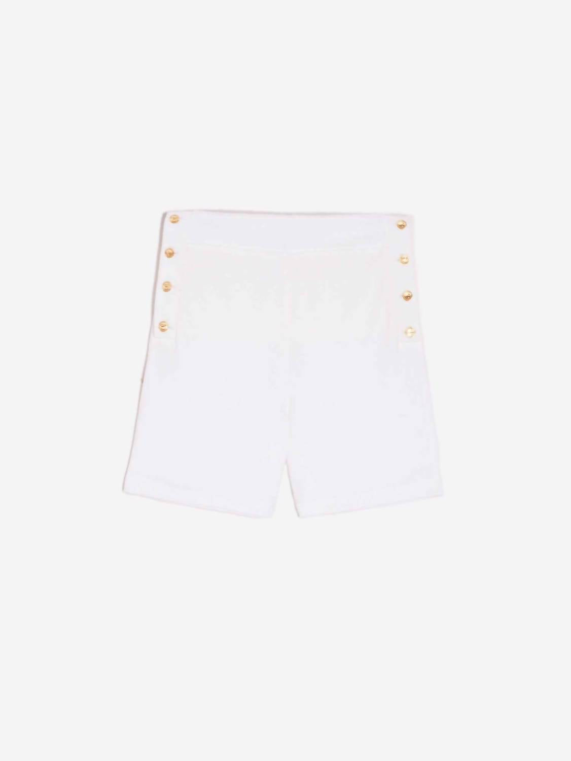 Откройте для себя незаменимую вещь для теплой погоды - стильные женские шорты-бермуды, искусно сшитые, чтобы гармонично сочетать в себе моду и функциональность. Ощутите идеальное сочетание стиля и комфорта с шортами-бермудами Tia от Vilagallo, идеально подходящими для минималистичного летнего образа. Эти женские шорты белого цвета с однотонным узором изготовлены из 100% хлопковой эластичной ткани для удобства и комфорта. Они застегиваются на шнуровку, украшены элегантными золотистыми пуговицами по бокам и имеют практичные карманы. Эти шорты идеально подойдут для шикарного званого ужина.
