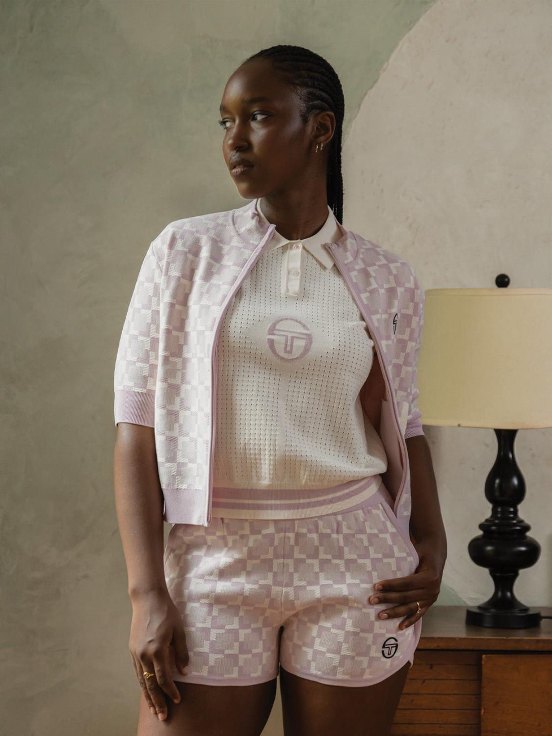 Для тех, кто ценит стиль и качество без компромиссов. Шорты Leila Short изготовлены искусным способом из роскошной матовой вискозы и элитной смеси волокон, легкой и дышащей, прочной, приятной на ощупь ткани, с использованием сложной жаккардовой техники «птичий глаз» на изнанке. Эти шорты с геометрическим узором по всей поверхности и контрастной окантовкой на закругленном подгибе в стиле «дельфин» создают ретро-образ. Сочетайте их с короткой спортивной курткой Leila Short Sleeve для идеальной посадки. (Продается отдельно)
