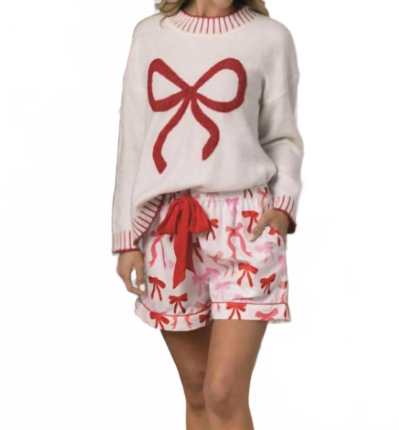 Заправьте любимую футболку в эти шорты с высокой талией, чтобы создать более непринужденный и стильный образ. Ощутите праздничный комфорт в пижамных шортах Bow Holiday от Mudpie с очаровательным принтом в виде банта в красно-розовых тонах. Эти легкие шорты нежно-розового оттенка оснащены регулируемым поясом из красного атласа с кулиской для идеальной посадки. Изготовленные из дышащего полиэстера, они идеально подходят для отдыха и сна. Уход: машинная стирка и сушка на веревке.