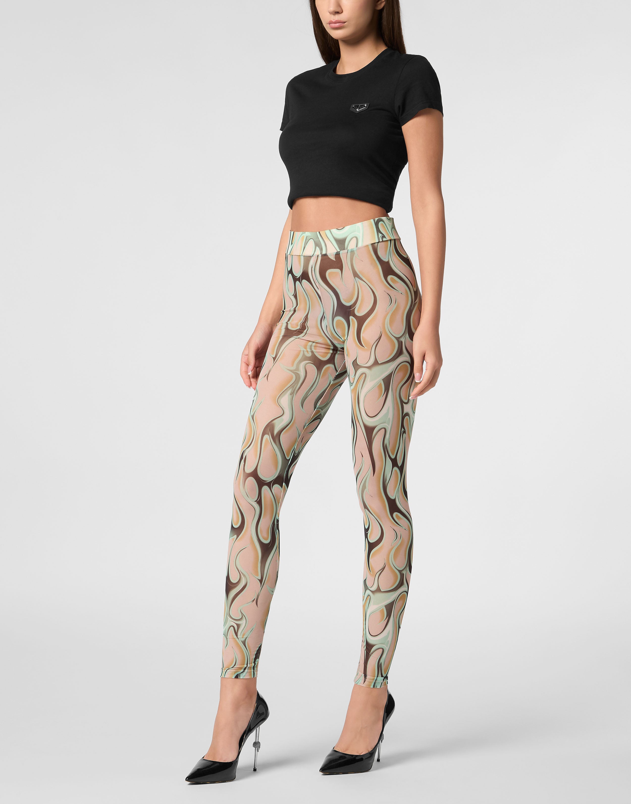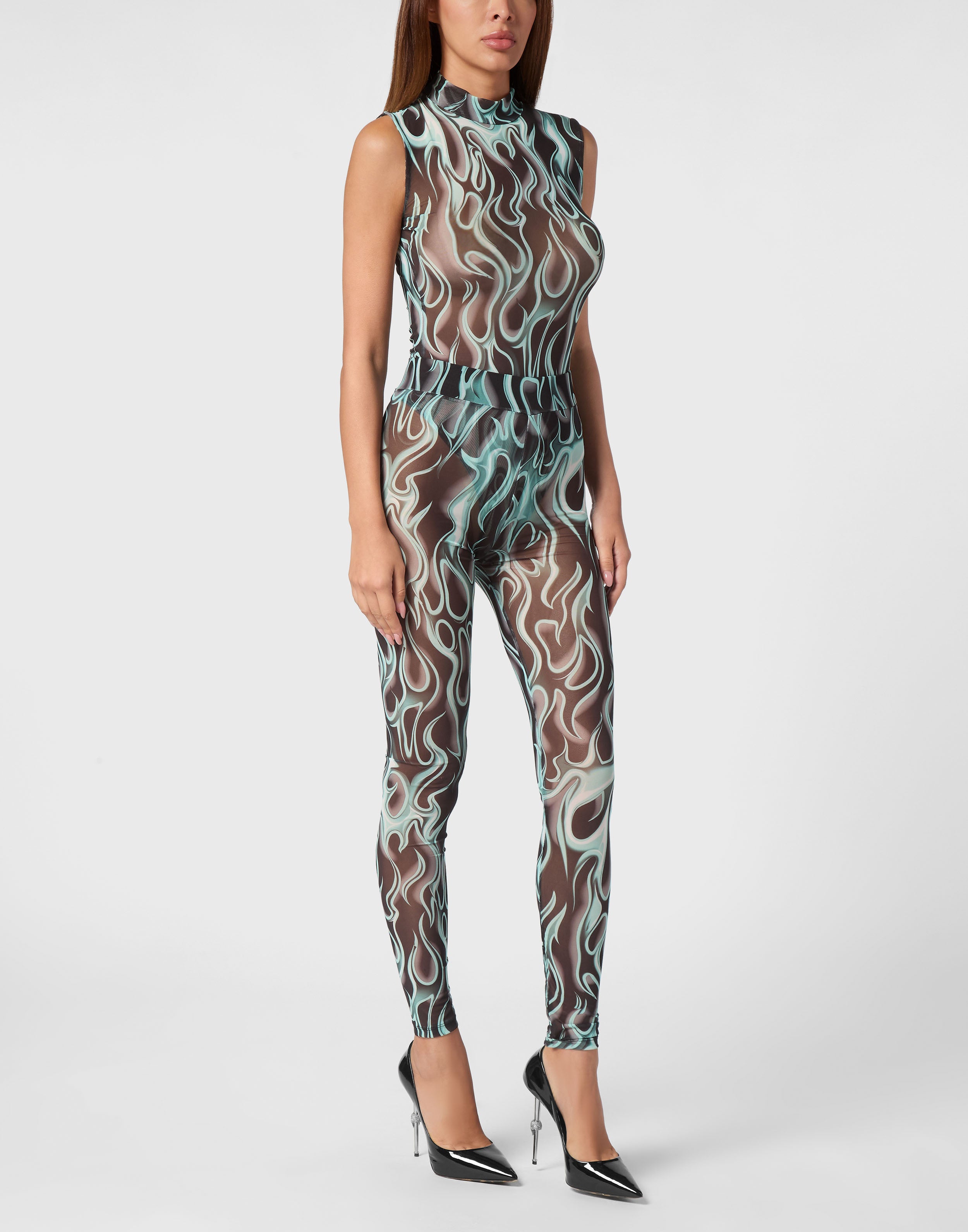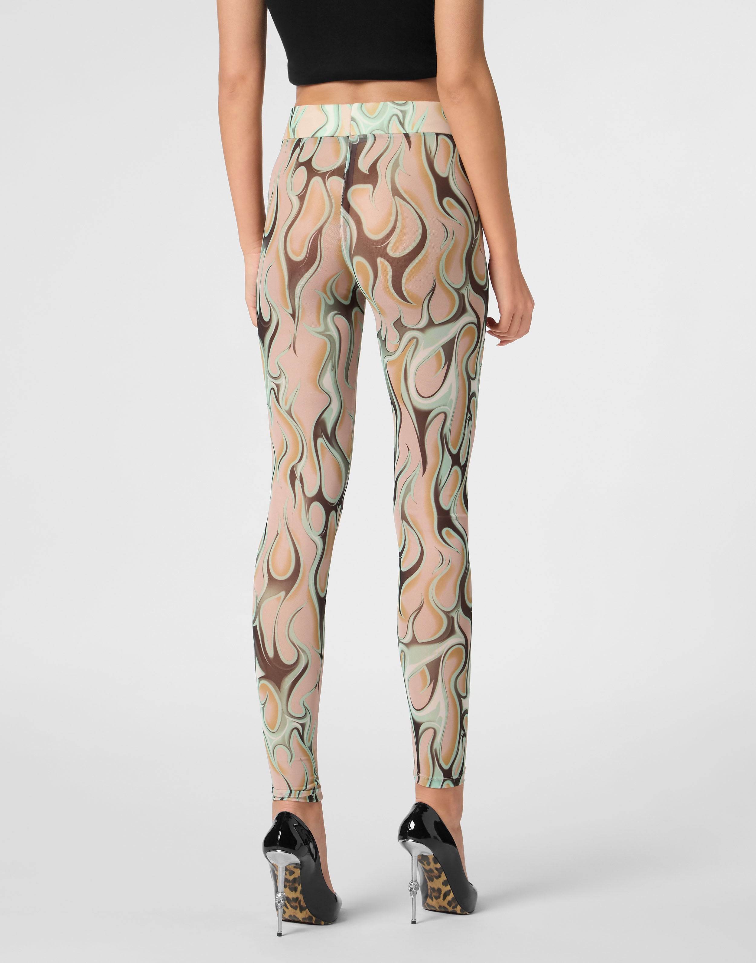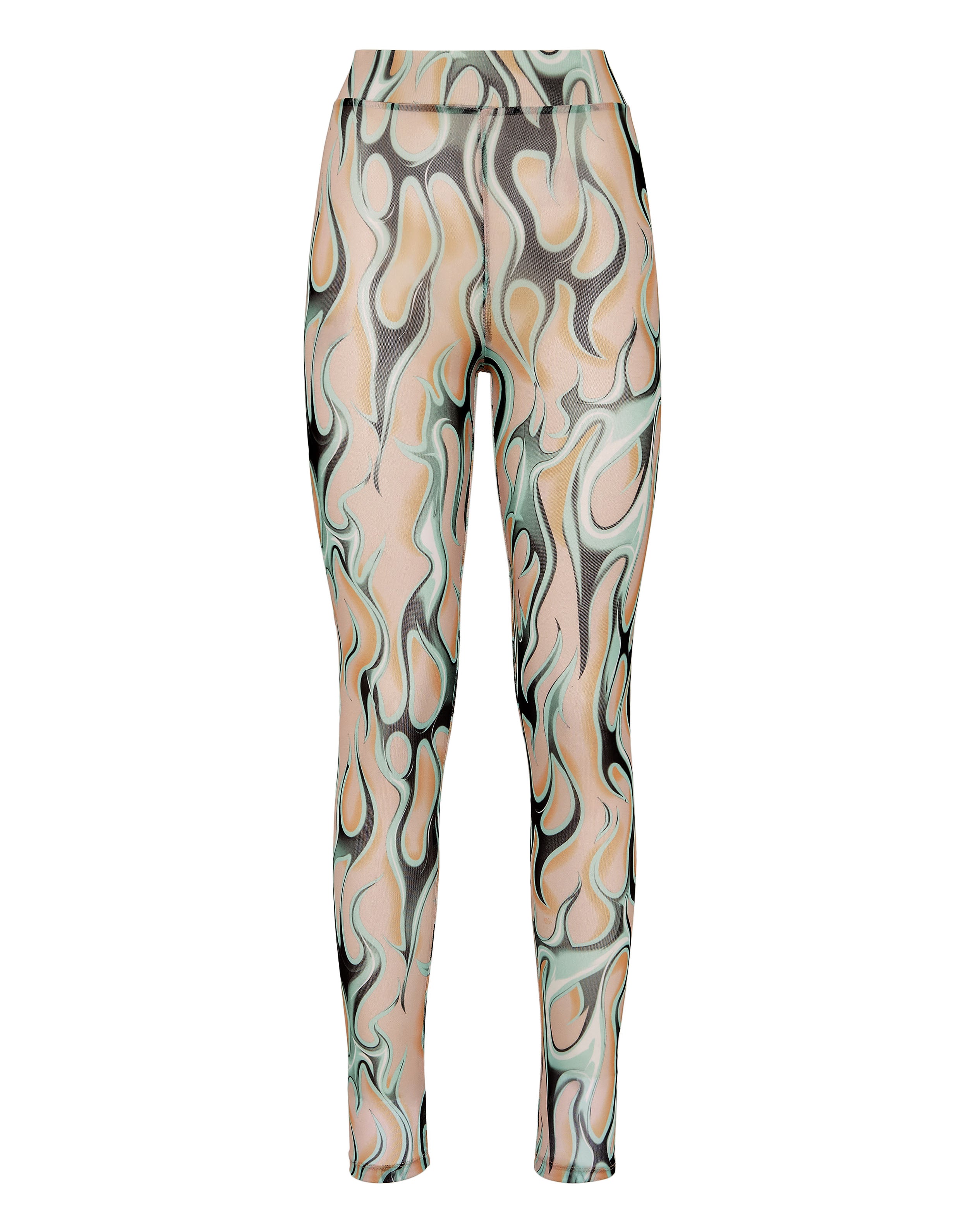 Подчеркните свою чувственность с помощью леггинсов из эластичного тюля с принтом в виде пламени по всей поверхности.