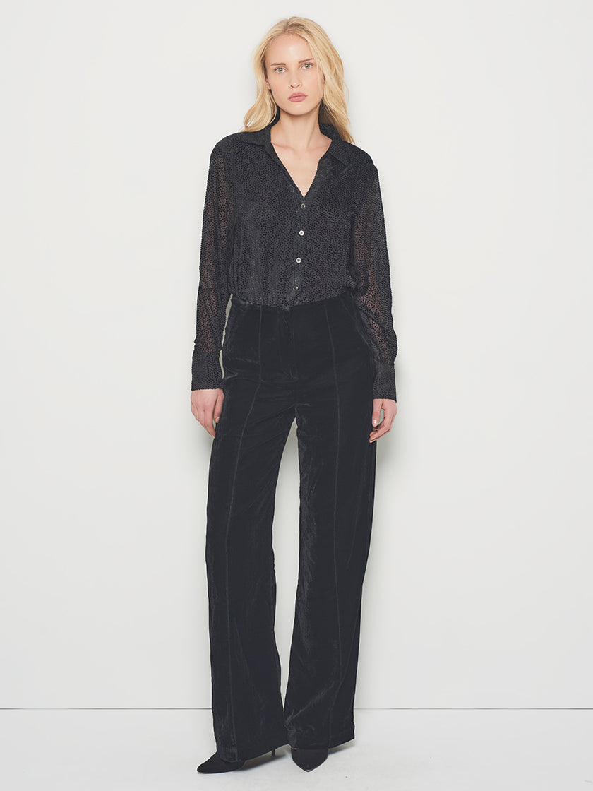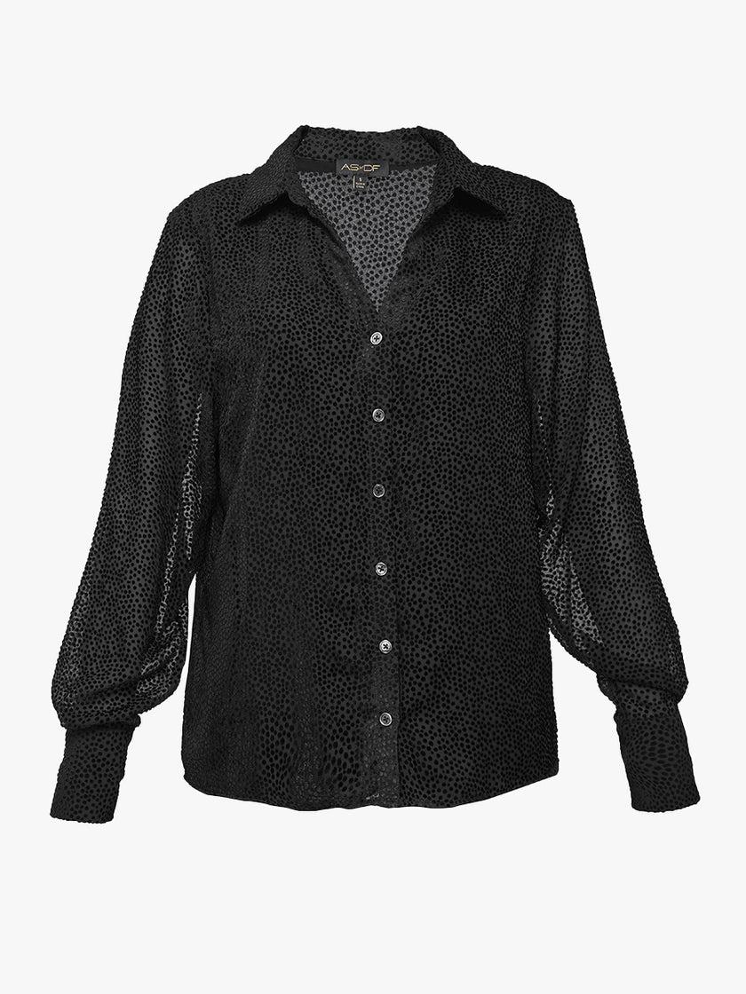 Наша черная блузка выполнена из роскошного бархата с замысловатым принтом в виде выжженных точек по всей длине. Эта веселая и нежная блузка заставит вас чувствовать себя одновременно кокетливо и шикарно. Украшена красивыми пуговицами-ракушками по центру спереди. Сочетайте с нашими подходящими комплектами: пиджаком-блейзером Fiona и брюками Fiona Velvet, чтобы создать полноценный образ ready-to-wear. Этот фасон свободный. Пожалуйста, заказывайте свой обычный размер. Если ваш размер промежуточный, мы рекомендуем уменьшить размер для более облегающего образа или увеличить для дополнительного комфорта. - Наша приверженность устойчивому развитию - Мы не используем пластик. Упаковка AS by DF изготовлена ​​из 100% переработанных материалов и на 100% биоразлагаема. • Свободный крой • Полностью на подкладке • Пуговицы по центру спереди • На модели размер 5-9, размер S (американский) • Состав: 70% переработанного полиэстера, 30% нейлона • Подкладка: 100% вискоза • Только химчистка