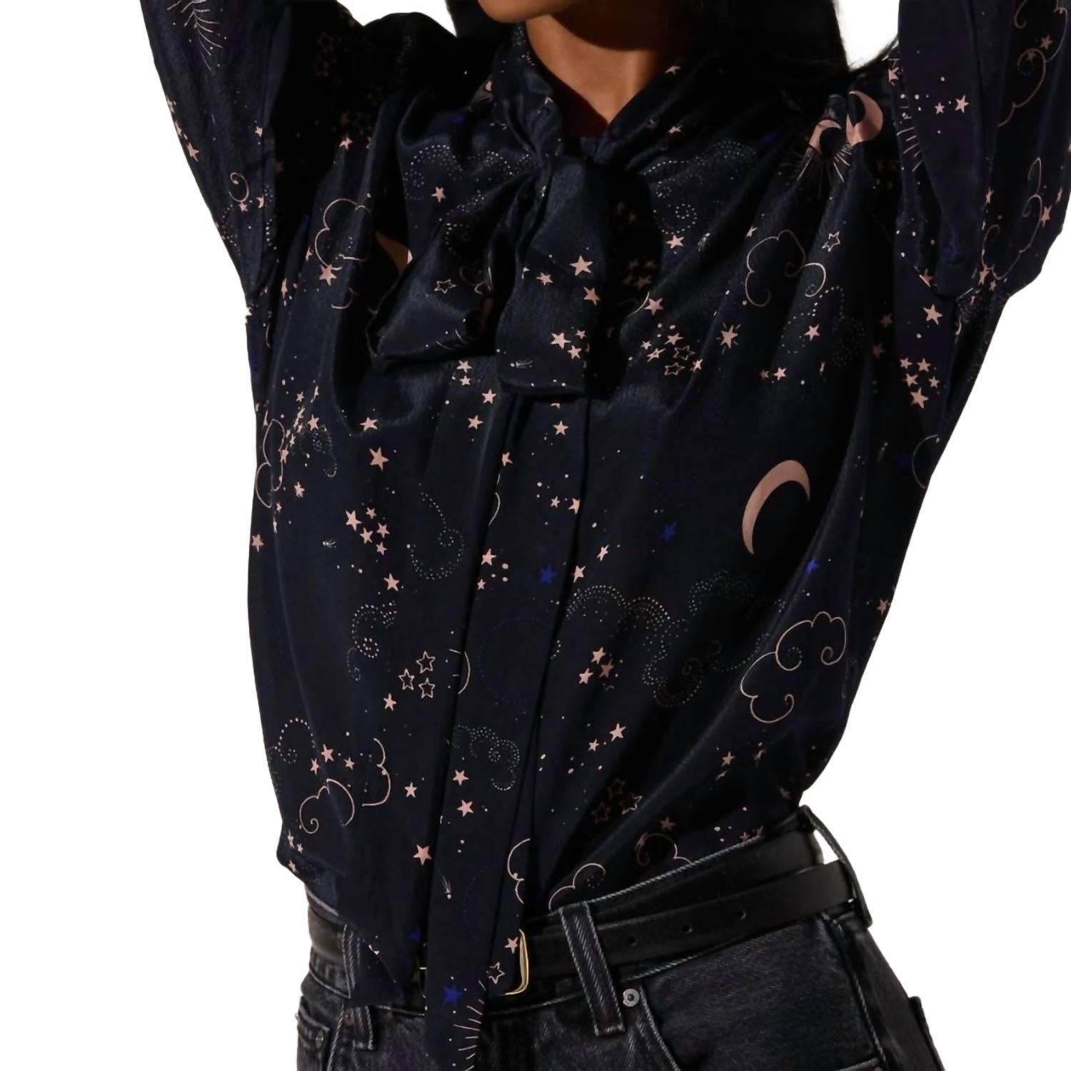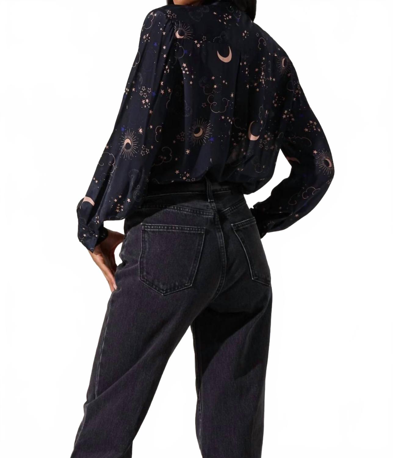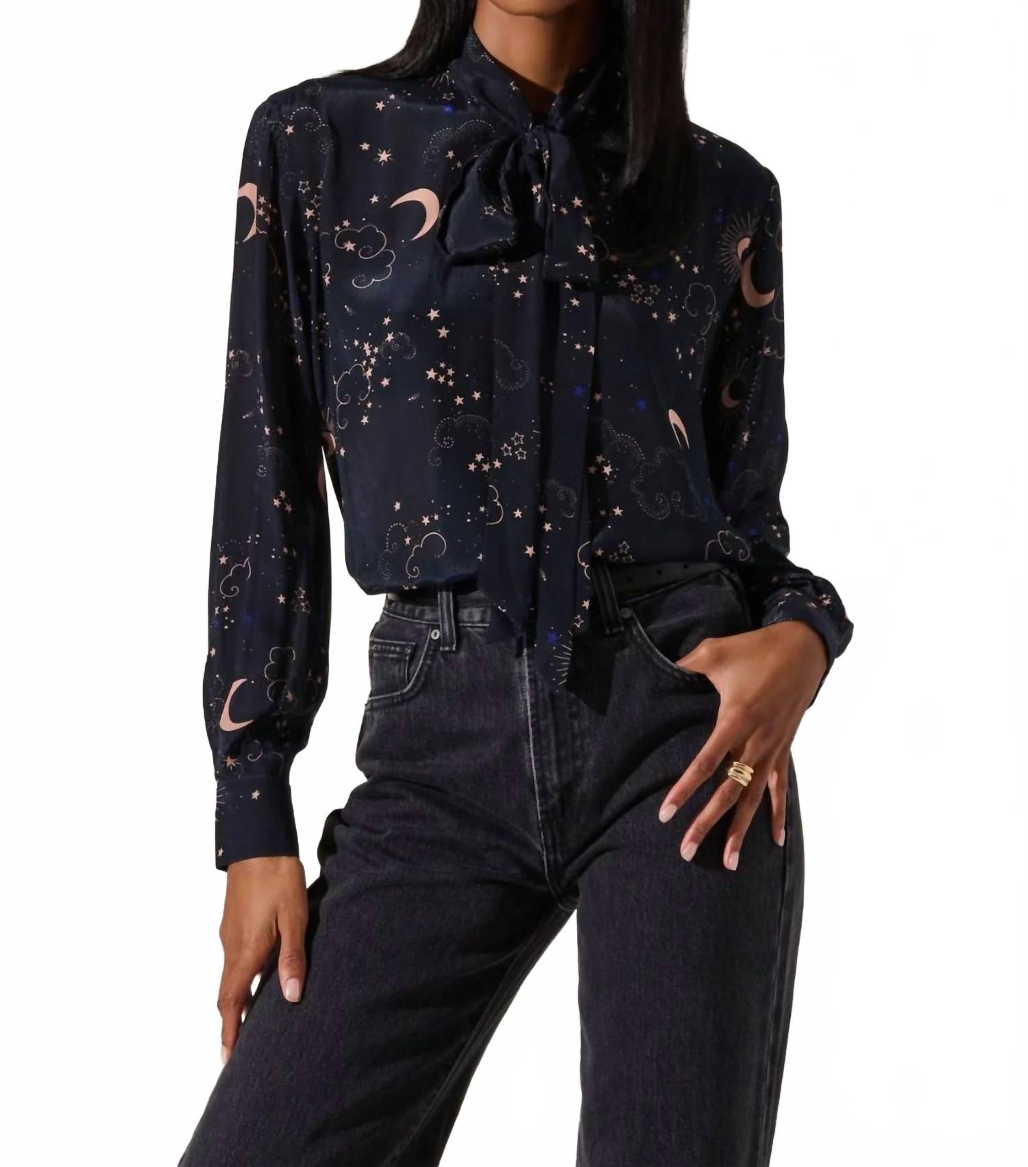 Блузка Mabry от ASTR The Label сочетает в себе изысканность и женственность. Длинные рукава насыщенного темно-синего цвета украшены причудливым принтом в виде ночных звезд. Этот топ из 100% вискозы имеет облегающий силуэт и легкую драпировку, идеально подходящую как для офиса, так и для отдыха. Застежка на пуговицы и круглый вырез горловины добавляют изысканности максималистскому тренду. Рекомендации по уходу: ручная стирка в холодной воде, сушка на веревке, глажка при необходимости. На модели рост 188 см, размер S.