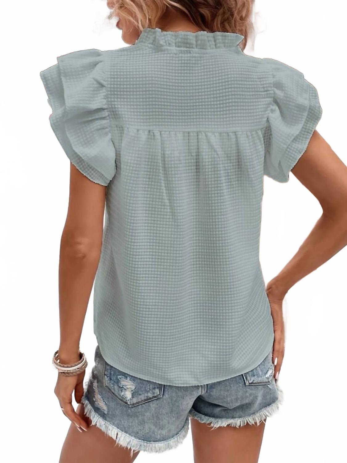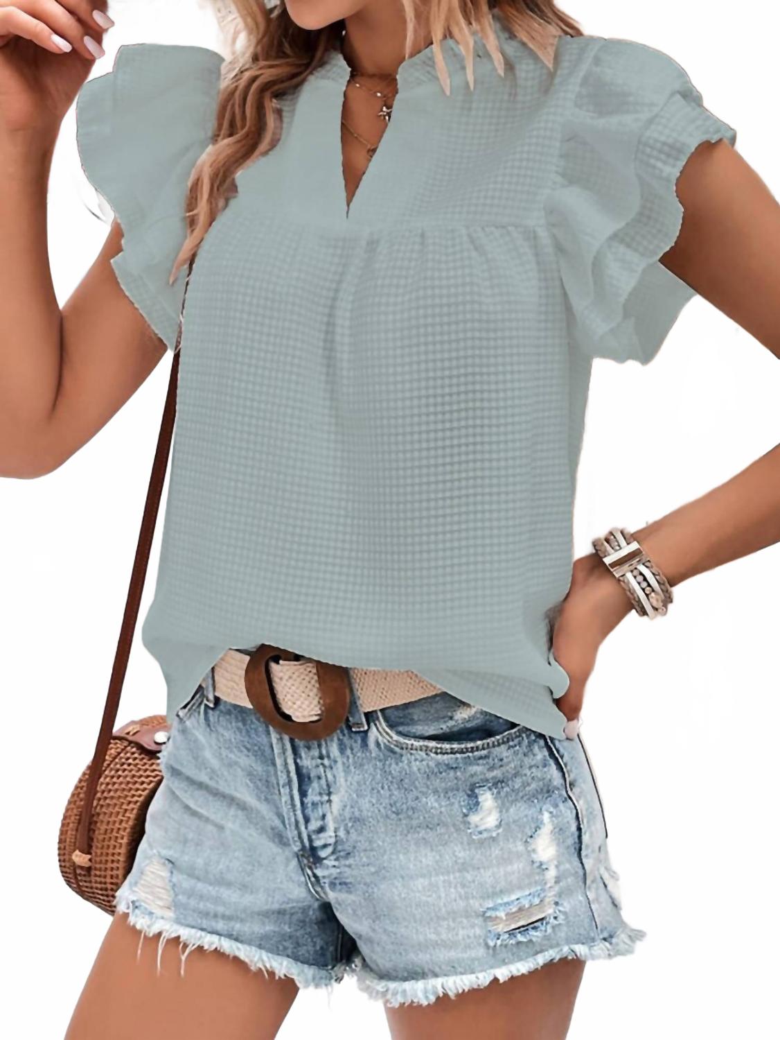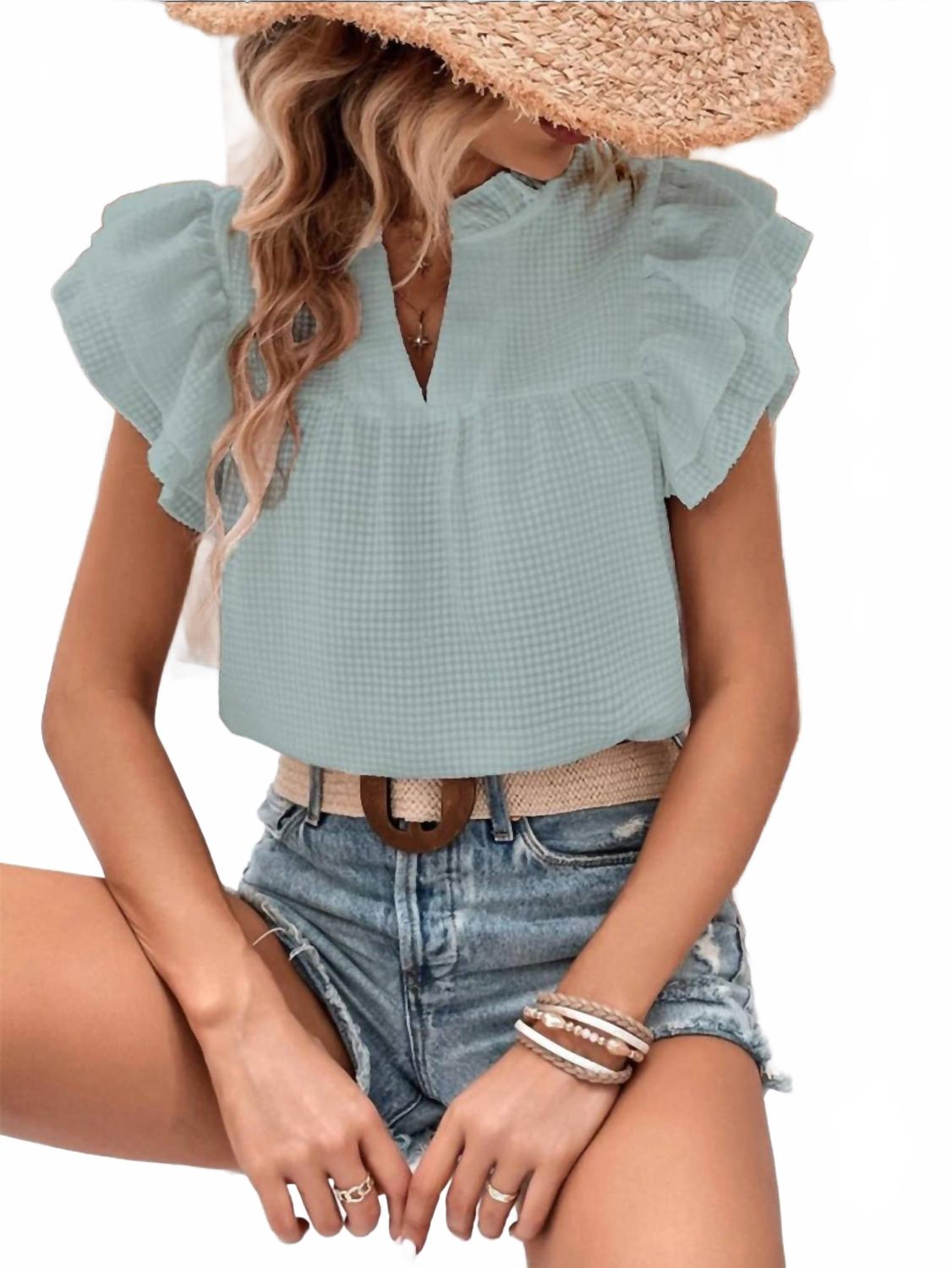 Блузка Ruffle & Go от Miss Sparkling синего цвета - ваш идеальный выбор для создания элегантного и непринужденного стиля. Эта блузка с рукавами-крылышками выполнена из 100% полиэстера с текстурированным рисунком, создающим ощущение легкости. V-образный вырез и застежка-липучка обеспечивают удобство при надевании. Уход прост: машинная стирка и сушка в стиральной машине - идеальный вариант для отпуска или минималистичного весеннего гардероба.