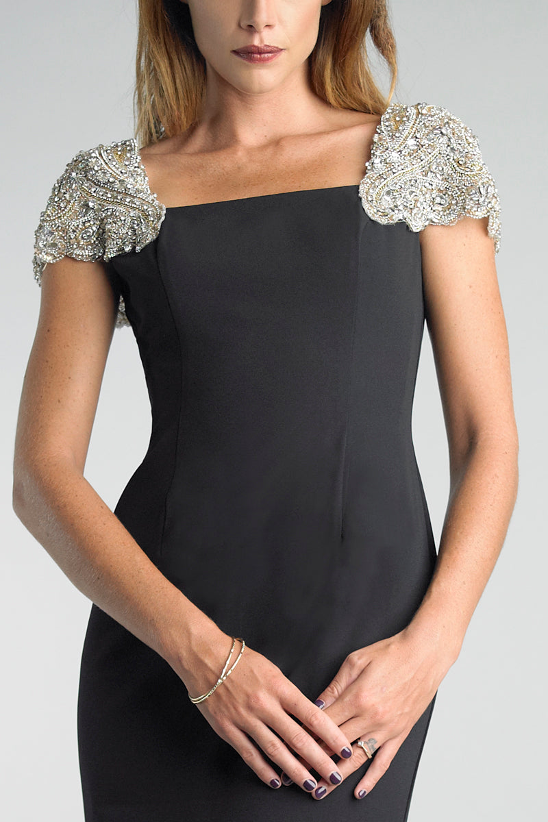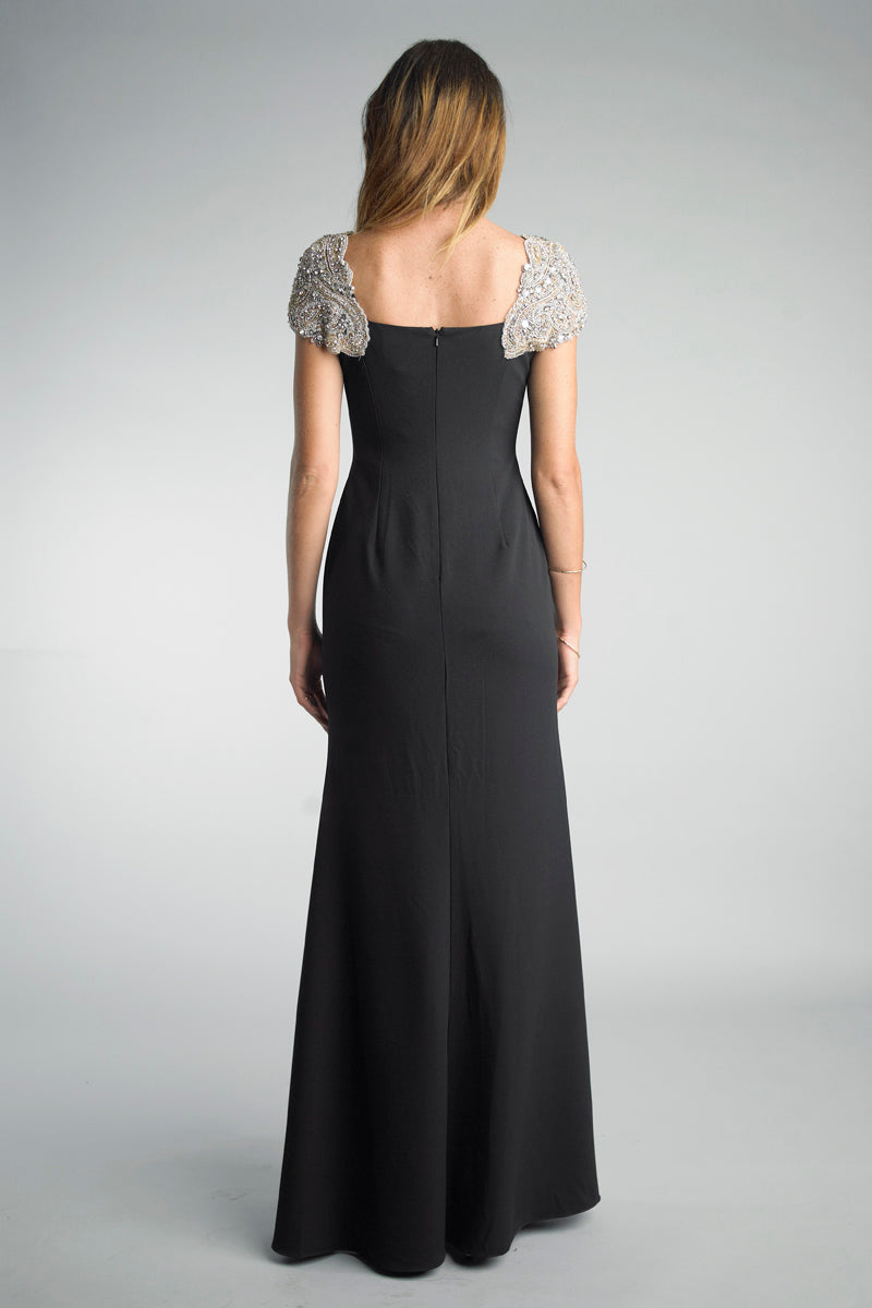Вечернее платье из матового джерси с рукавами-крылышками, украшенными вышивкой