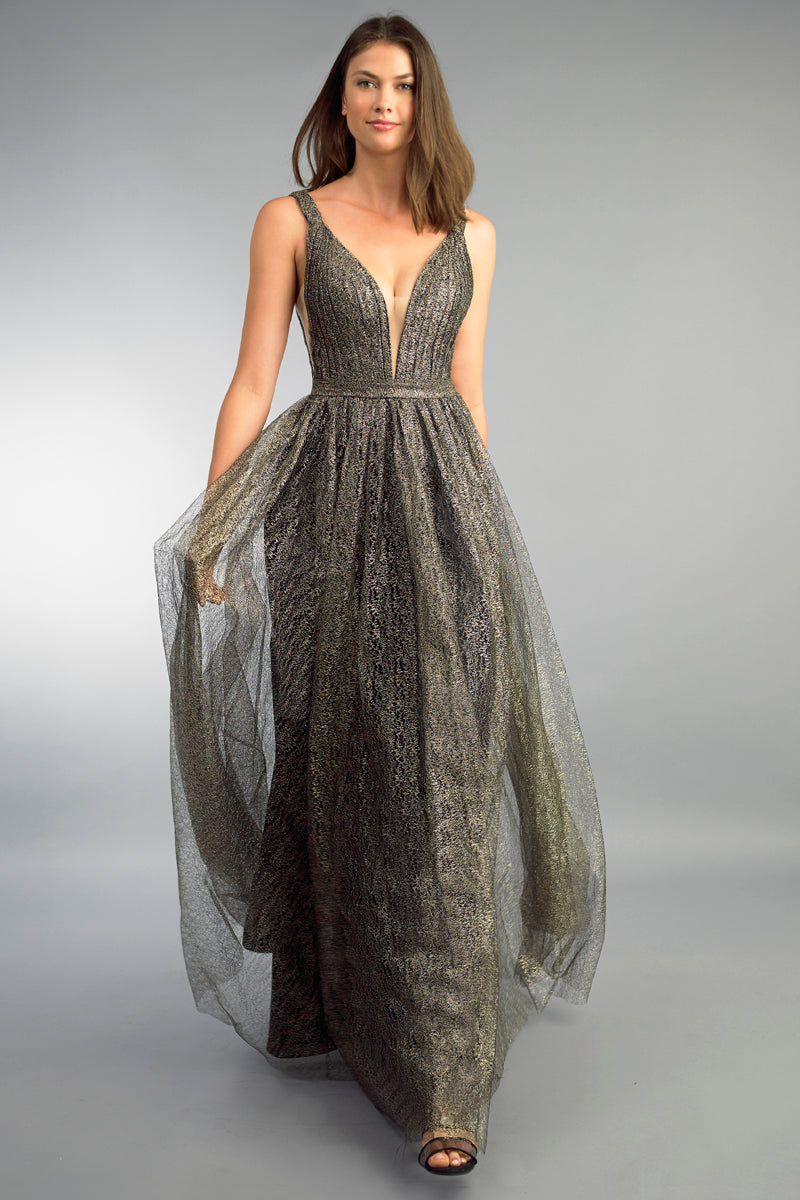 Платье без рукавов с V-образным вырезом и металлическим кружевом