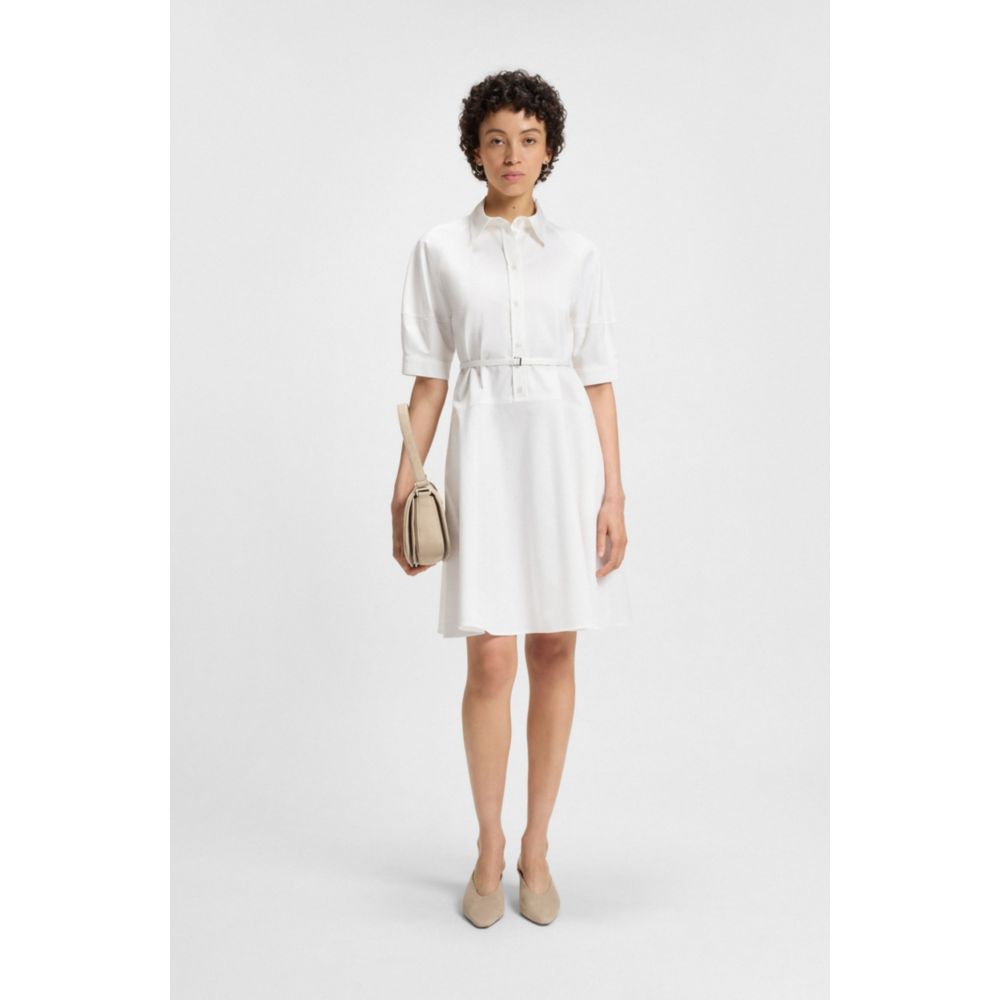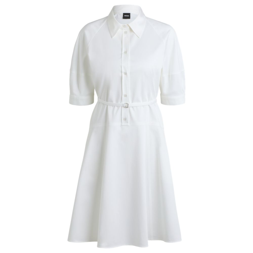 Это женское платье BOSS с современными швами - это свежий взгляд на классику. Платье выполнено из саржи из смеси хлопка и эластичного хлопка. Ремень с пряжкой и полузастежка создают креативный эффект. Заостренный воротник завершает образ. Изделие частично изготовлено из . Наши стандарты не допускают использования синтетических удобрений, пестицидов и генетически модифицированных семян.