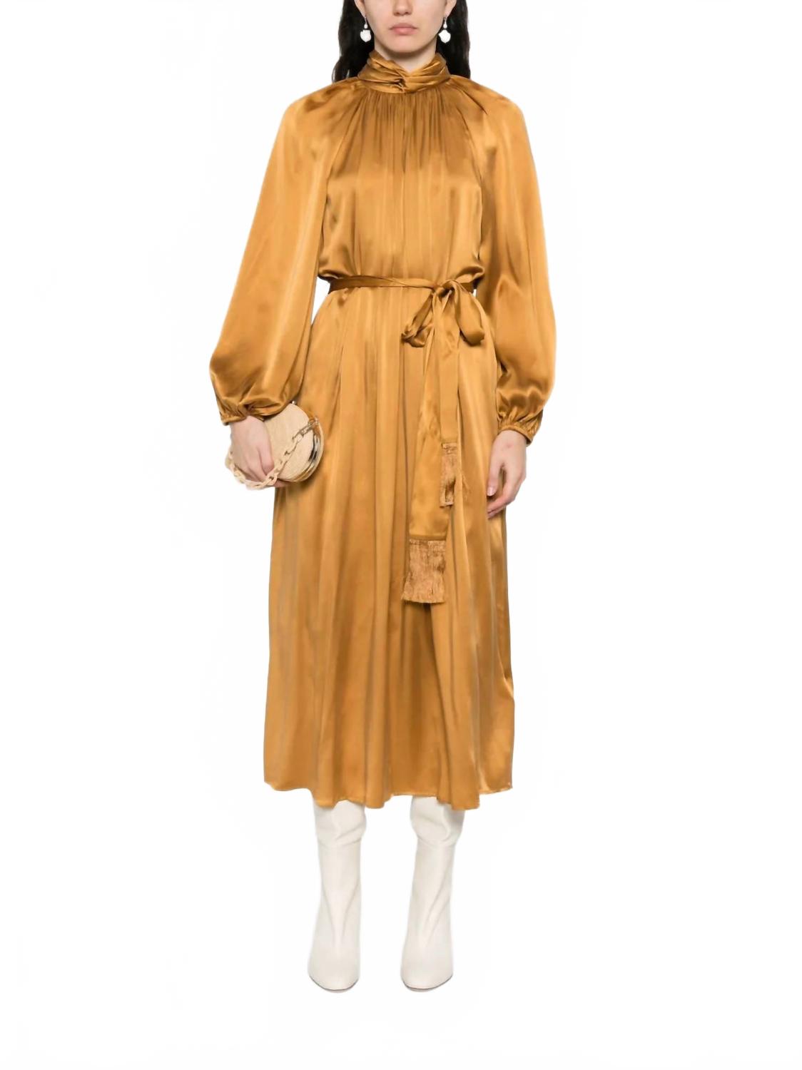 Идеальное платье с длинными рукавами для прохладных месяцев. Насладитесь элегантностью в платье-футляре Hypnotic Twist из коллекции Zimmermann осень-зима 2025. Это шелковое платье цвета ириски с длинными рукавами-блузоном и изысканным воротником-стойкой, подчеркнутым застежкой-молнией. Облегающий силуэт и съемный пояс на талии обеспечивают идеальную посадку для любого вечернего мероприятия. Платье изготовлено из 100% импортного шелка и подлежит только химчистке.