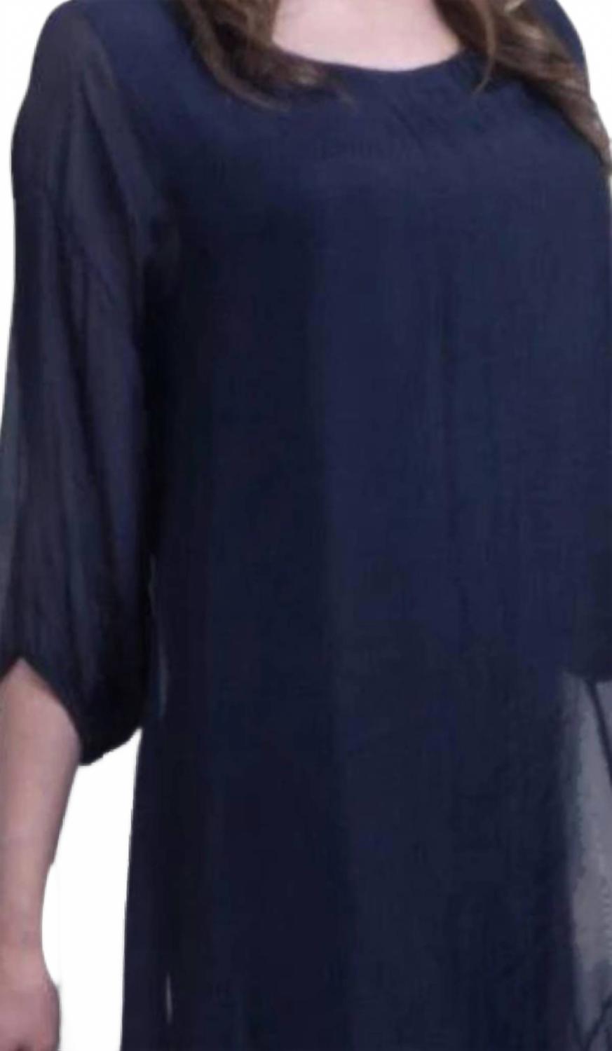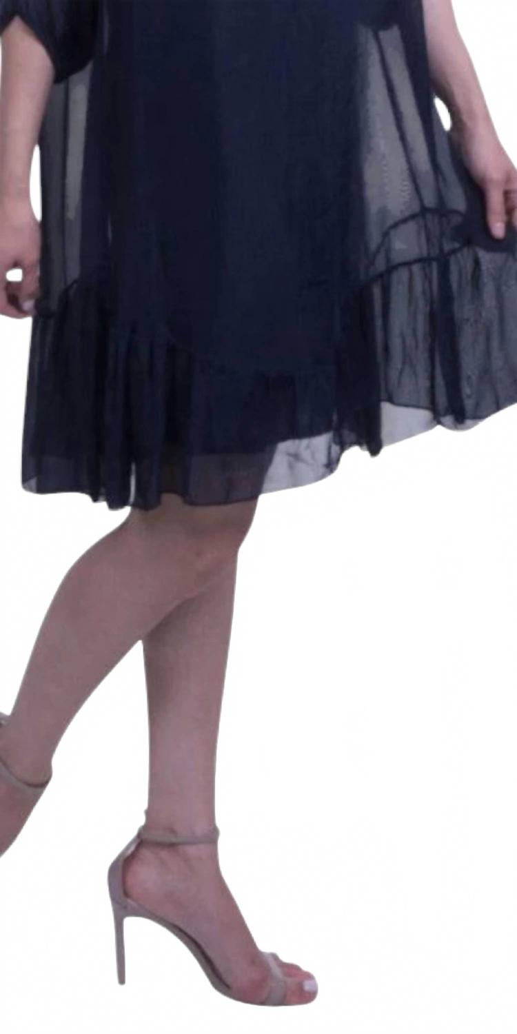 Идеальное мини-платье для теплых месяцев. Ощутите элегантность в мини-платье Strolia Silk от GIGI MODA, созданном для изысканных ужинов на берегу моря и оживленных званых ужинов. Это изысканное темно-синее платье с рукавами три четверти и подчеркивающим фигуру круглым вырезом, с прозрачным шелковым верхом и удобной комбинацией из вискозного трикотажа на плечах. Сделано в Италии, оно имеет классический А-силуэт и присборенный оборчатый край, который подчеркивает стиль. Состав ткани: 100% шелк (наружная часть), 95% вискоза, 5% эластан (внутренняя часть). Тип застежки: надевается. Инструкции по уходу: только сухая чистка. Универсальное и шикарное, это платье воплощает спокойную роскошь, идеально подходит для весеннего сезона и пасхальных встреч.