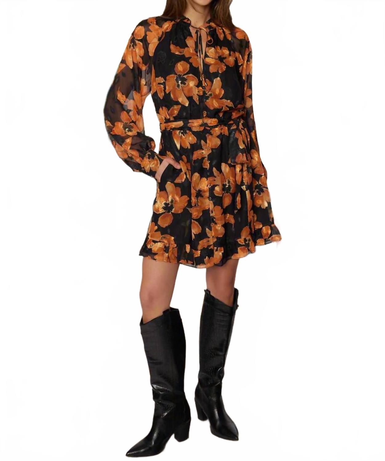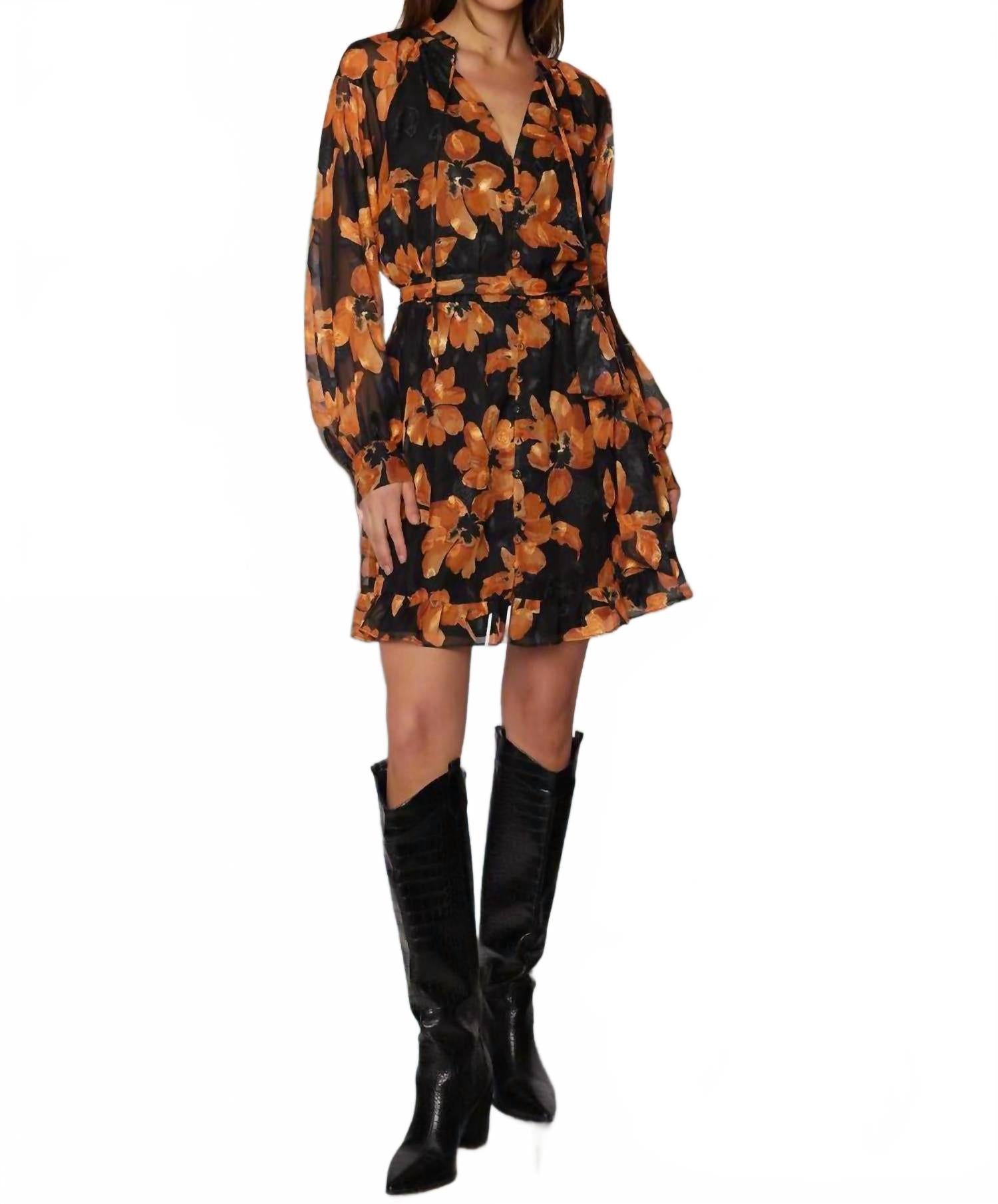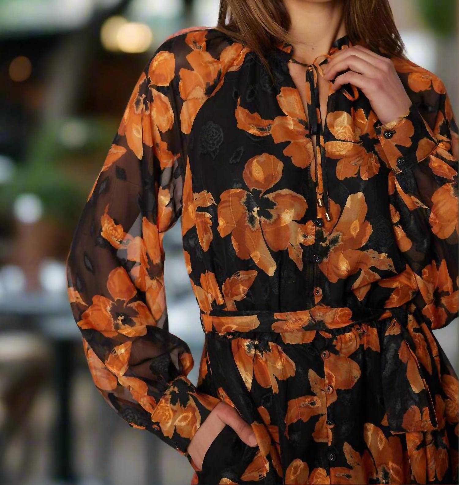 Идеальное мини-платье для теплых месяцев. Окунитесь в элегантность с мини-платьем Lost + Wander Golden Rendezvous, которое идеально подойдет для осенних мероприятий. Это платье с длинными прозрачными рукавами, выполненное из легкого шифонового жаккарда, украшено шикарным черно-оранжевым цветочным узором. Платье имеет привлекательную длину мини с оборкой по низу и регулируемым поясом на талии для идеальной посадки. Застежка на пуговицы и изящный V-образный вырез, вдохновленные стилем бохо-шик, дополняют элегантный и в то же время жизнерадостный образ. Уход: ручная стирка в холодной воде, сушка на веревке. На модели: рост 178 см, объем груди 88 см, объем талии 68 см, объем бедер 88 см. Размер S.