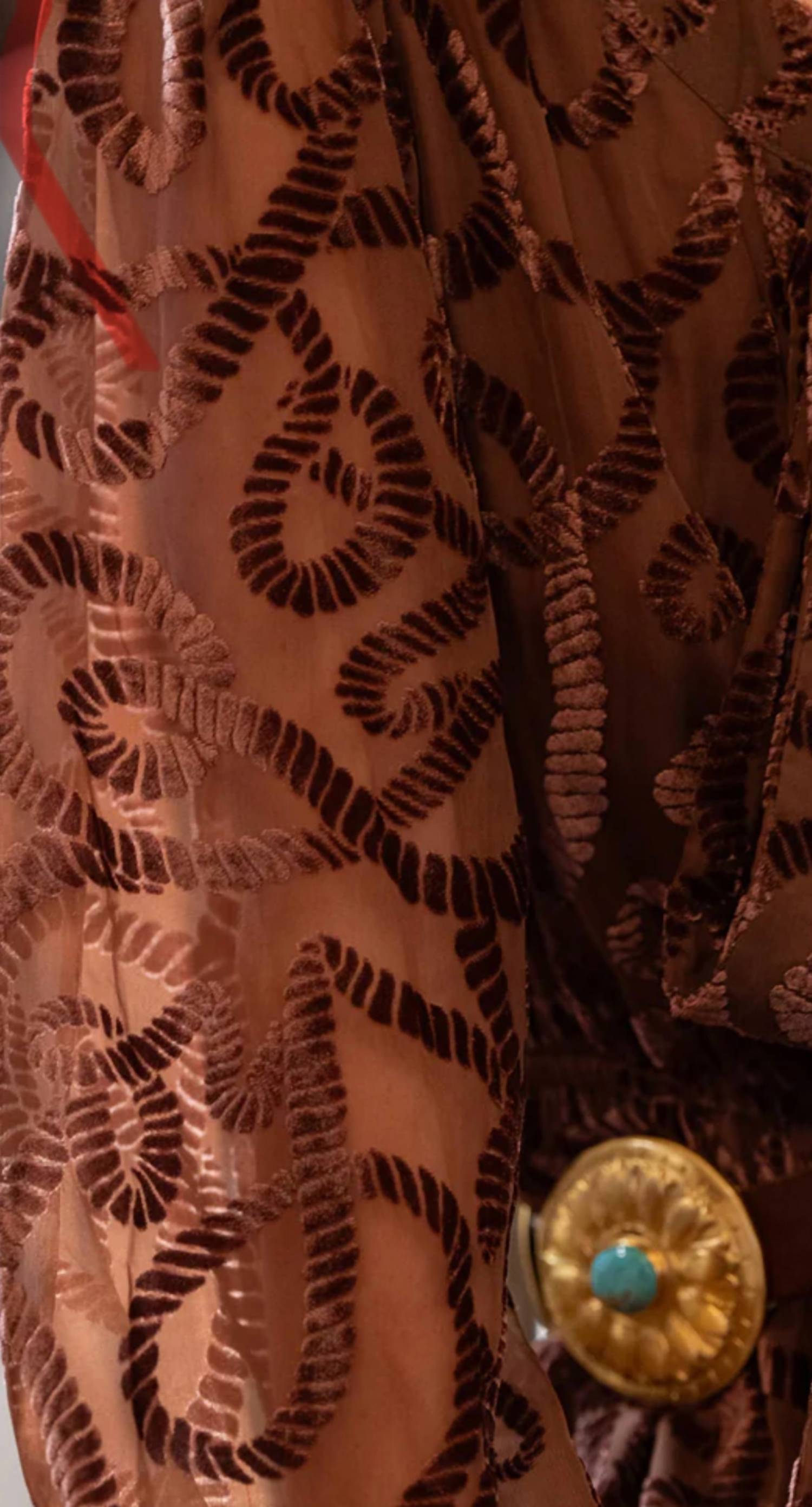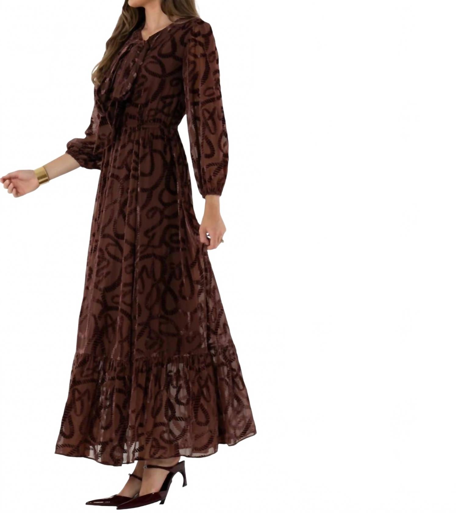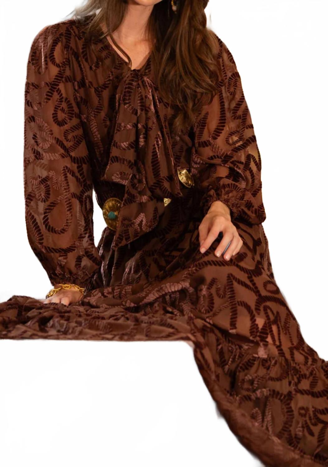 Идеальное платье с длинными рукавами для прохладных месяцев. Откройте для себя платье макси Emily McCarthy Lillian в цвете Rope/Velvet-Wine - шедевр в стиле бохо-шик, идеально подходящий для осенних вечерних мероприятий. Платье с длинными рукавами-блузонами и эластичными манжетами, игривым вырезом-бантом и многоуровневым макси-низом в стиле вестерн. Изготовленное из 51% вискозы и 49% нейлона с подкладкой из 100% полиэстера, оно обеспечивает комфорт и элегантность. Застежка - молния. Уход: машинная стирка на деликатном режиме в холодной воде с использованием щадящего моющего средства, сушить на открытом воздухе. Модель: Мэри Энсли, рост 180 см, размер S.