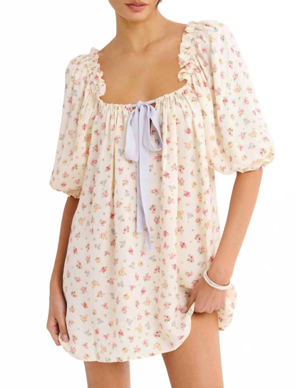 Мини-платье Bloom от Rumored с его мечтательным цветочным принтом и нотками бохо-шика воплощает очаровательный деревенский шарм. Это платье прямого силуэта, изготовленное из 100% вискозного крепа, имеет короткие рукава и квадратный вырез, украшенный контрастными завязками и вырезом-капелькой. Длинные рукава застегиваются на застежку, а эластичные вставки и оборки придают ему особый шарм. Длина платья от плеча до подола составляет 25 дюймов (61 см), оно идеально подходит для отпуска и легко поддается химчистке. На модели размер XS (рост 5 футов 9 дюймов, бюст 32 дюйма, талия 25 дюймов, бедра 35 дюймов).