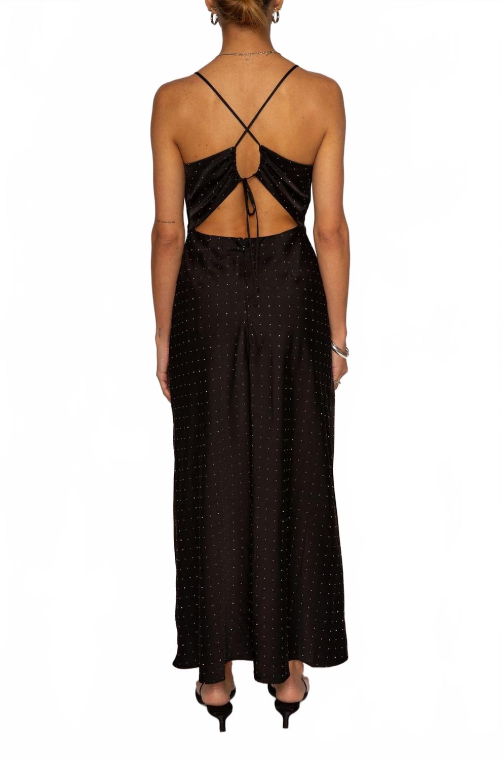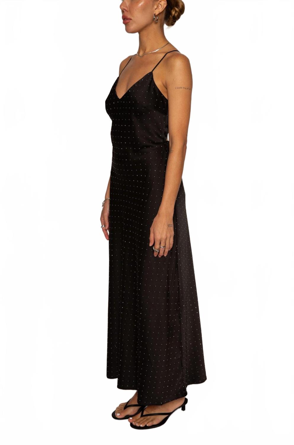 Дополните это макси-платье любимым эффектным ожерельем и босоножками для идеального образа. Представляем макси-платье Bonney от ASTR - великолепное вечернее платье, воплощающее сдержанную роскошь. Это платье-комбинация классического черного цвета с тонкими бретельками и V-образным вырезом, украшенным термофиксированными стразами для придания образу гламура. Платье изготовлено из 95% полиэстера и 5% эластана. Оно полностью на подкладке, имеет вырез на спине и регулируемые завязывающиеся крест-накрест бретели для идеальной посадки. Застежка: потайная молния сзади. Уход: только химчистка. Идеально подходит для летних мероприятий и праздников.