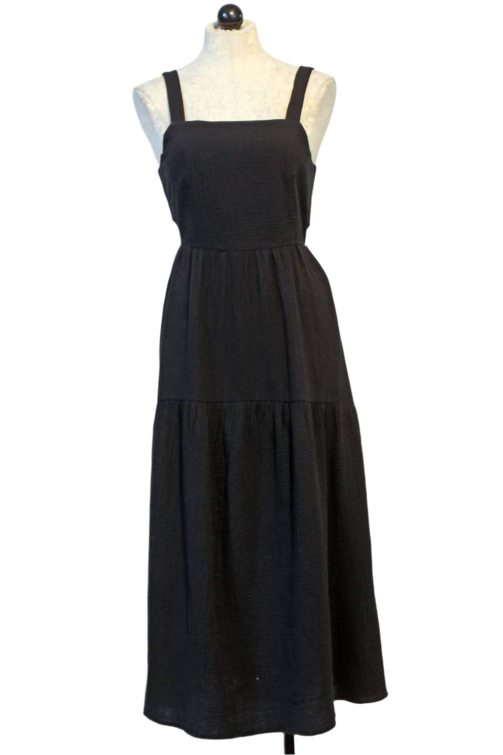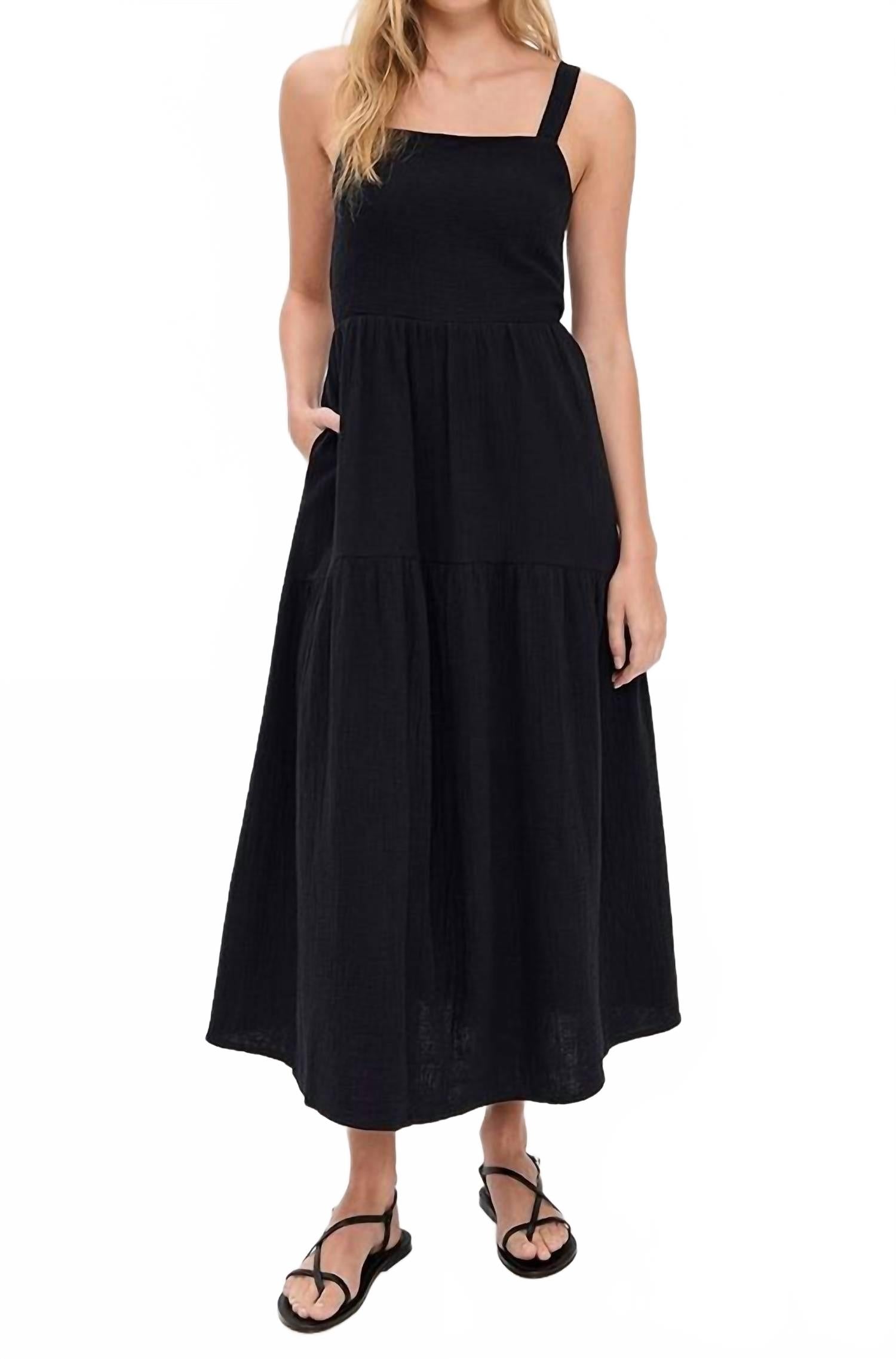 Кто не любит хорошее макси-платье? Это платье вы будете носить каждый сезон. Насладитесь элегантностью с платьем макси The Go-To от Favorite Daughter, которое станет незаменимым предметом вашего летнего гардероба. Это однотонное черное макси-платье без рукавов выполнено из 100% органического хлопка. Платье имеет квадратный вырез и эластичную талию для идеальной посадки. Платье имеет струящуюся двухъярусную юбку в пол и практичные карманы. Широкая завязка сзади. Рекомендации по уходу включают ручную стирку и сушку на веревке, что гарантирует долговечность и комфорт на таких мероприятиях, как званый ужин или празднование Дня независимости.