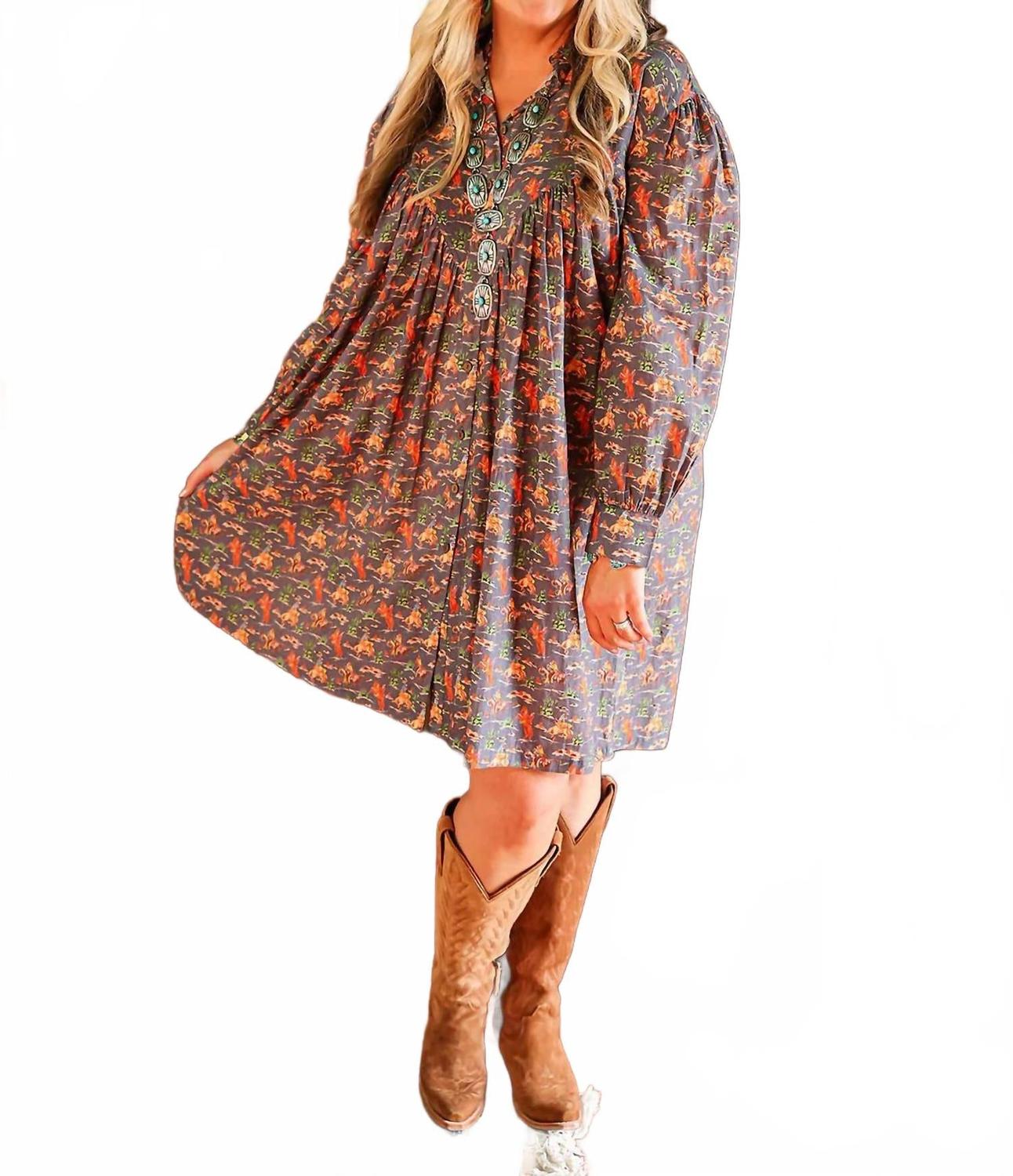 Идеальное платье с длинными рукавами для прохладных месяцев. Представляем женское платье Mustang от Layerz Clothing - шедевр в стиле бохо-шик, идеально подходящий для осенних мероприятий. Это платье-футляр с длинными рукавами и эффектным воротником-стойкой дополнено разноцветным цветочным узором и винтажными ковбойскими принтами, подчеркивающими его неповторимый шарм. Модель легко надевается благодаря застежке-липучке, а яркий красный воротник с отделкой в ​​стиле вестерн воплощает дух вестерн. Это платье идеально подходит для отпуска или прогулок на закате, оно станет стильным выбором, воплощающим суровый шарм.