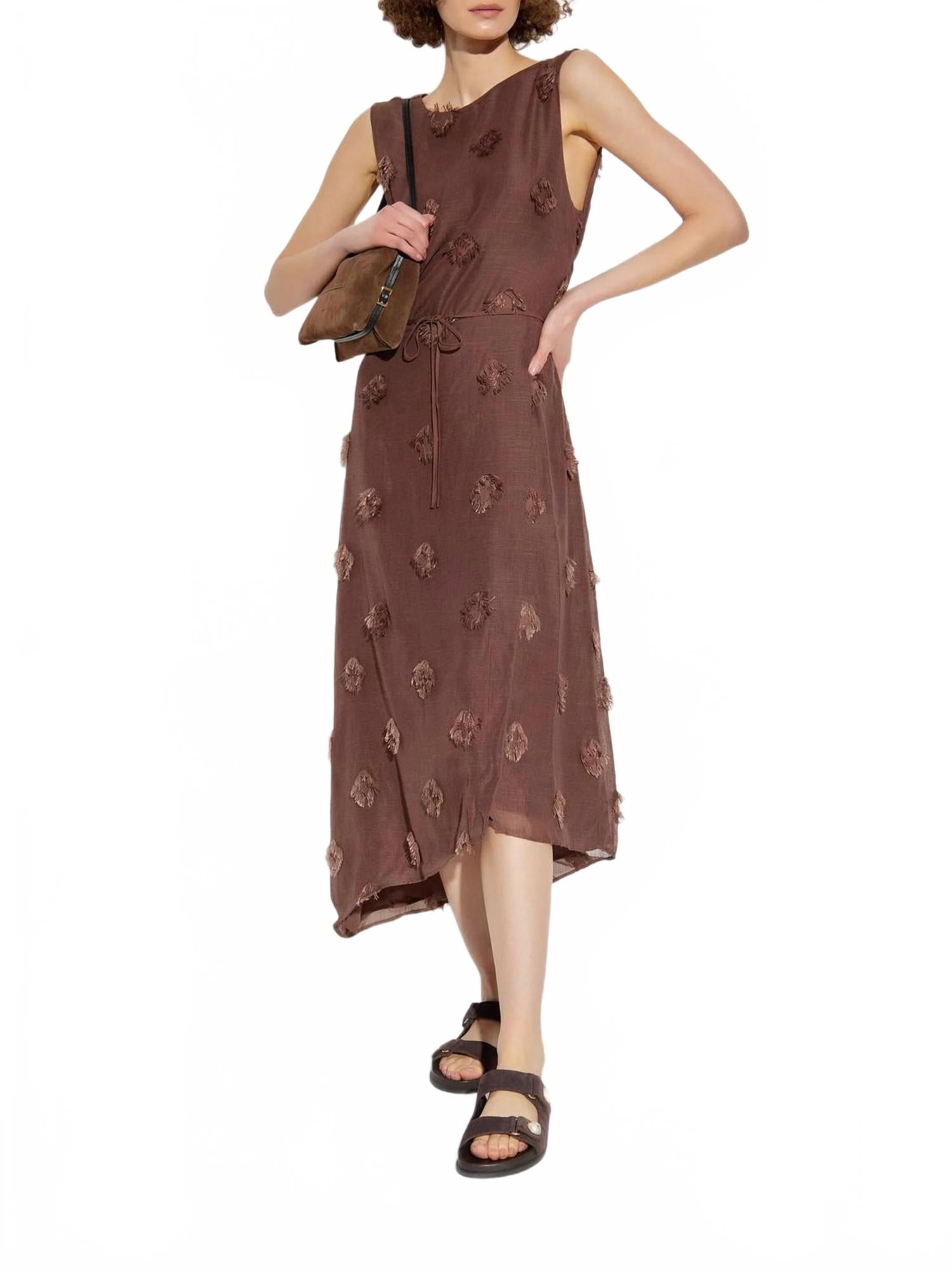 Платье идеальной длины существует. Откройте для себя очаровательное платье миди Saportofino от SAMSOE - идеальное сочетание элегантности и стиля. Это платье А-силуэта без рукавов в оттенке French Roast украшено цветочной вышивкой и асимметричным кроем с эффектной открытой спиной. Платье изготовлено из 75% переработанного полиэстера и 25% полиэстера, подкладка - из вискозы. Низ платья необработанный, а завязка сзади придает ему уникальный вид. Ухаживайте за этим великолепным платьем, просто стирая его вручную, чтобы сохранить его безупречный внешний вид. Оно идеально подходит для незабываемого званого ужина.