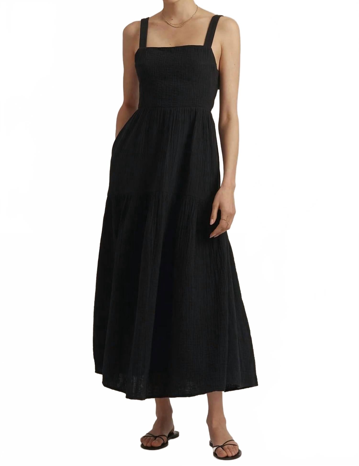 Платье макси, столь же милое, сколь и удобное. Подчеркните свой вечерний стиль с платьем Go To Dress от Favorite Daughter, созданным для минималистичной элегантности. Это платье макси без рукавов однотонного черного цвета отличается изысканным квадратным вырезом, бретельками и очаровательной завязкой сзади. Струящаяся многоярусная юбка изящно переходит в шикарную длину 136 см и дополнена практичными карманами в боковых швах для дополнительного удобства. Изделие изготовлено из 100% органического хлопка, обеспечивает комфорт и воздухопроницаемость. Застежка: надевайте. Инструкции по уходу: машинная стирка.