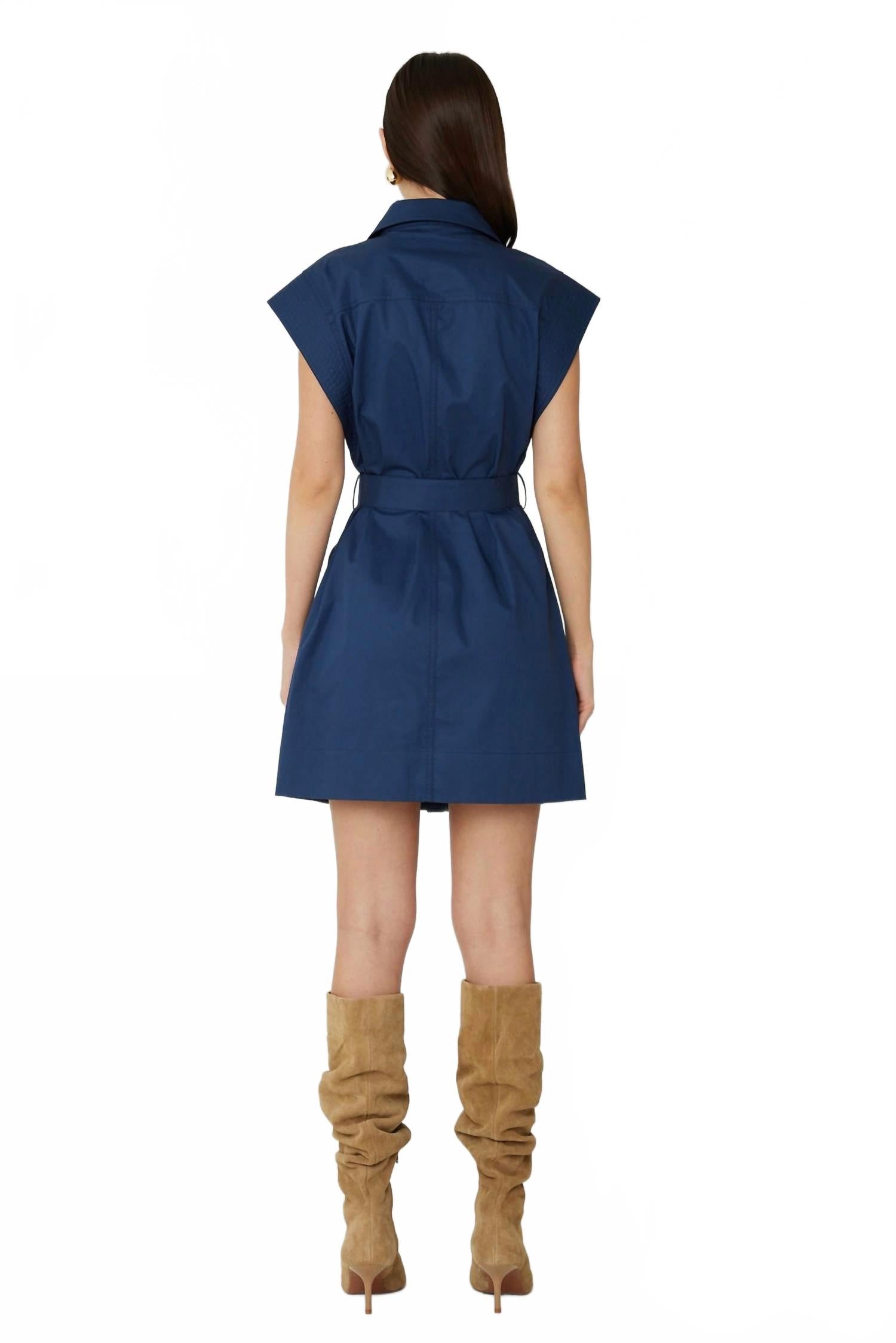 Встречайте мини-платье Mason от js71 - шикарное дополнение к вашему гардеробу в изысканном темно-синем оттенке. Платье с рукавами-крылышками и длиной 88 см от плеча до подола выполнено из 100% хлопка и дополнено элегантной застежкой на золотистые пуговицы. Платье рубашечного силуэта с боковыми карманами и поясом идеально подходит для званого ужина или легкого осеннего дня. Страна происхождения: импортное. Рекомендации по уходу: только сухая чистка. Рост модели: 178 см, обхват груди: 88 см, обхват талии: 66 см, обхват бедер: 88 см. На модели размер S.