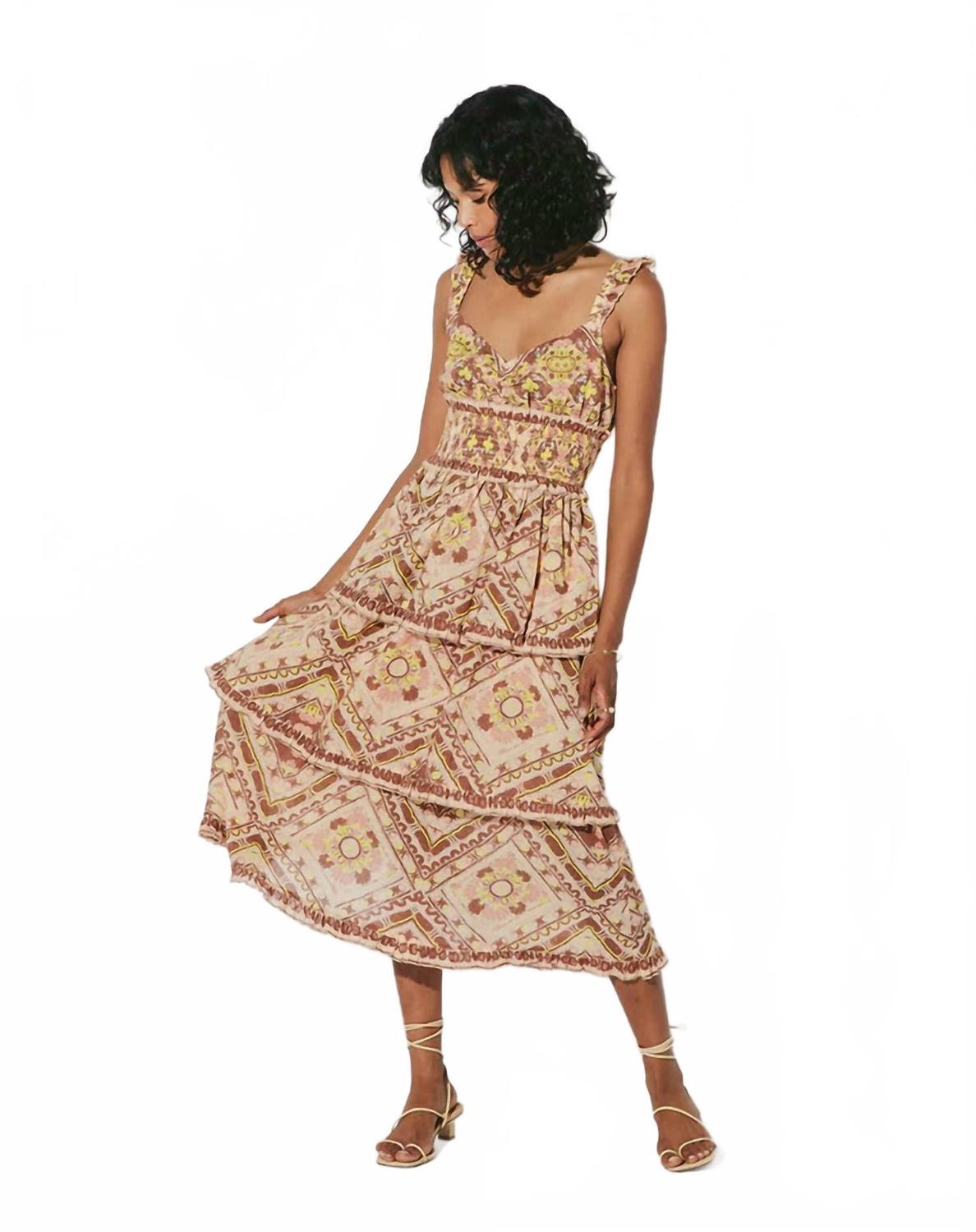 Удобное и милое, это повседневное платье сочетает в себе все необходимое. Платье Stella Ankle Dress от Cleobella, выполненное из 100% органического хлопка, сертифицированного GOTS, - залог экологичности. Это эффектное изделие с многоуровневым кроем с оборками и очаровательным геометрическим принтом, гармонично сочетает в себе уверенность и женственность. А-силуэт с тонкими бретельками-спагетти и вырезом в форме сердечка идеально подходит для праздничных вечеринок или пасхальных посиделок. Платье легко носить благодаря застежке-липучке. Для ухода за ним необходима ручная стирка и сушка на веревке.