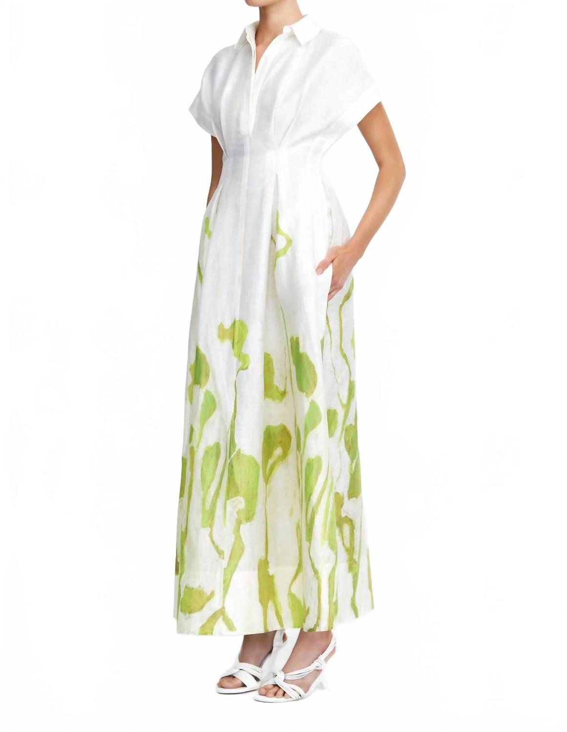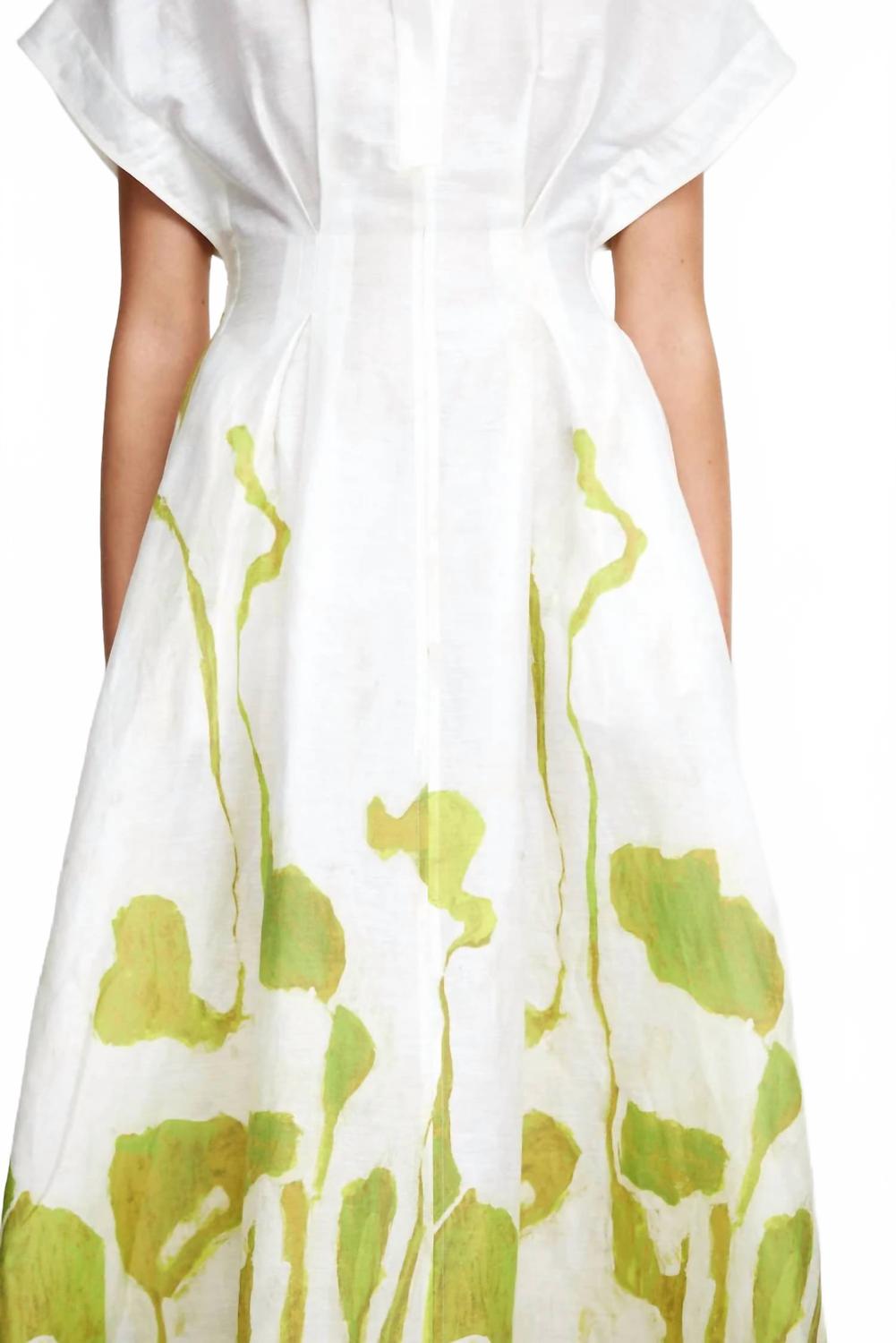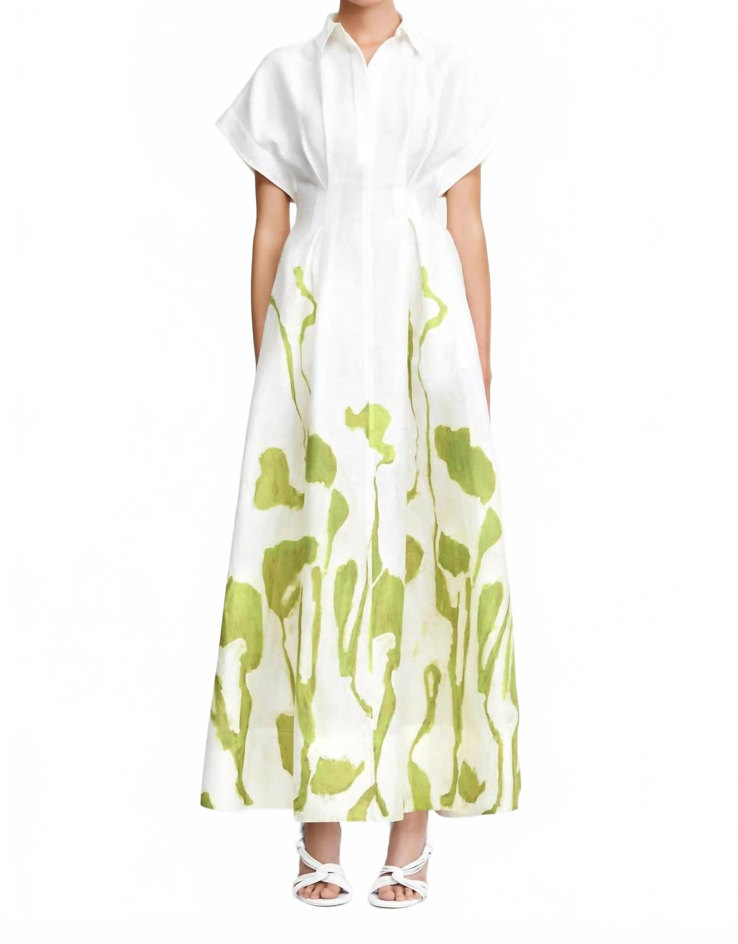 Откройте для себя элегантность, вдохновленную природой, в коротких рукавах с очаровательным узором Clover Canopy. Изготовленный из смеси 74% вискозы, 18% лиоцелла и 8% льна, он имеет текстуру, имитирующую лен, со структурированным силуэтом и воротником-стойкой. Длина миди идеально подходит как для вечерних мероприятий, так и для садовых вечеринок. Застежка: центральная застежка на пуговицы спереди с регулируемым завязкой сзади для индивидуальной посадки. Рост модели: 178 см / 5 футов 10 дюймов, размер AU 8 / US 4.
