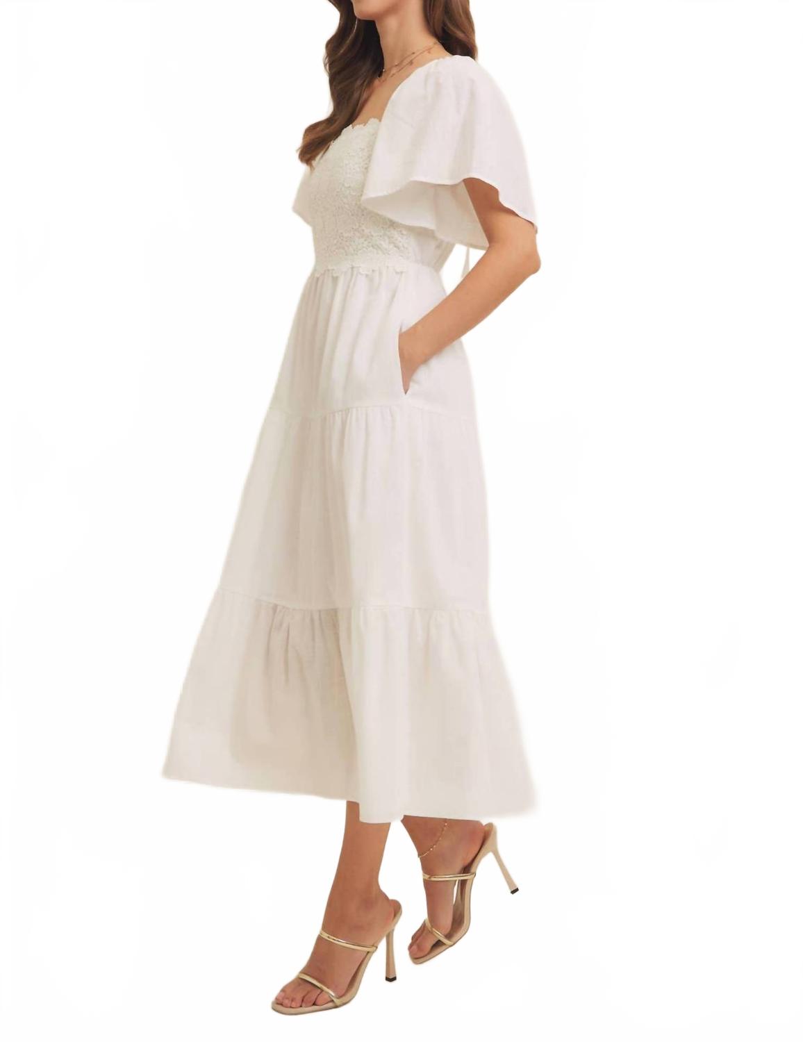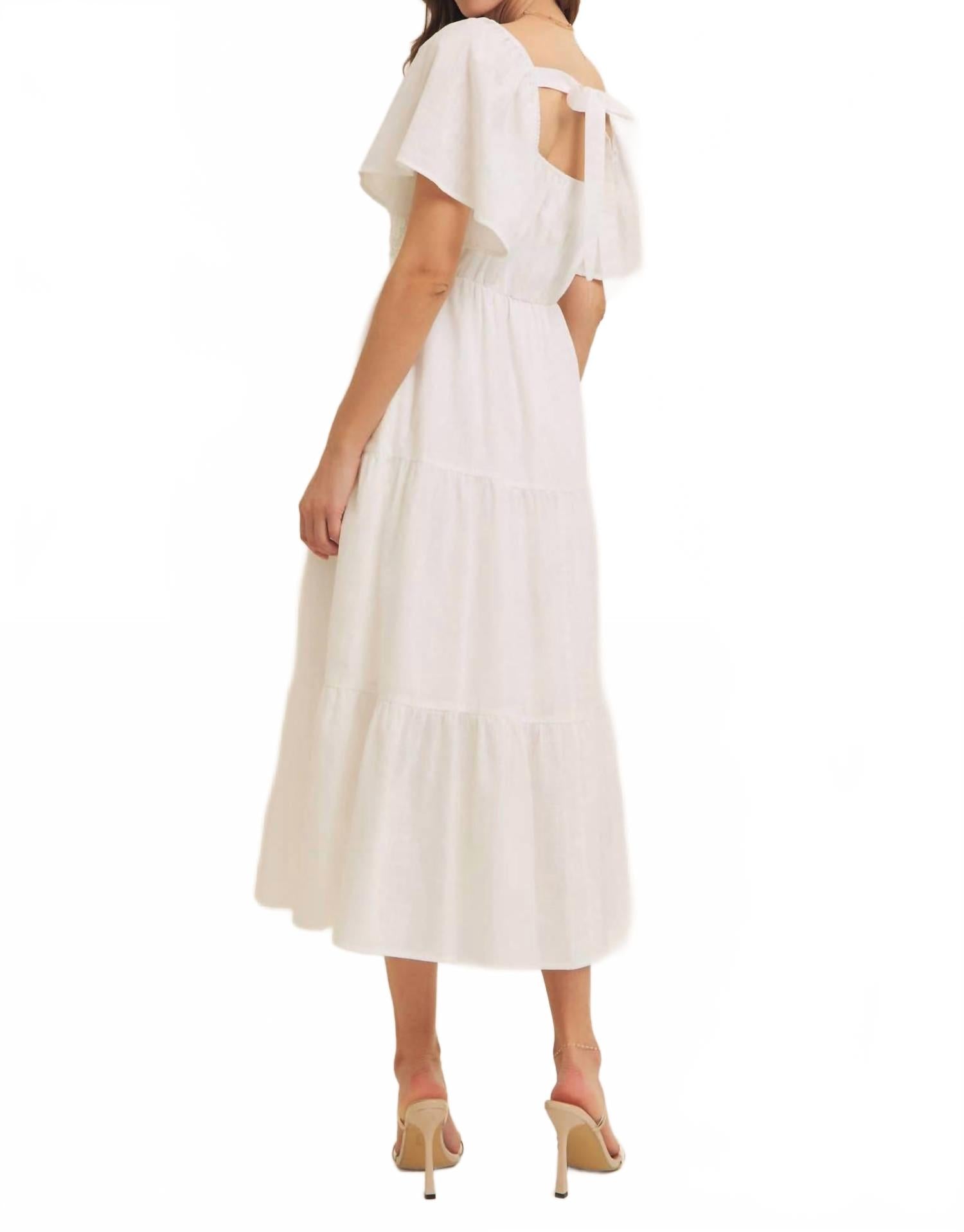 Повседневное, удобное и милое! Платье, которое вы будете носить весь сезон. Представляем многоярусное платье Dahlia от In February - элегантное дополнение к вашему весеннему гардеробу в классическом белом цвете. Это платье с короткими рукавами-крылышками, изысканной кружевной отделкой и многоярусным А-образным силуэтом. Благодаря выгодному квадратному вырезу и завязке на завязке, оно создаст легкую элегантность, идеально подходящую для свадебных торжеств или неформальных прогулок. Идеально подходит для теплой погоды, от праздничных вечеринок до повседневных торжеств.