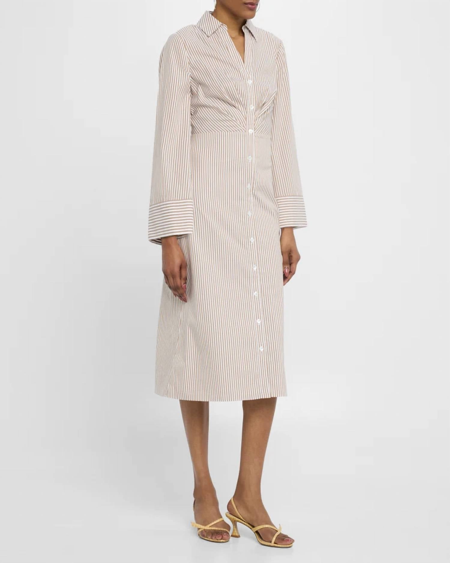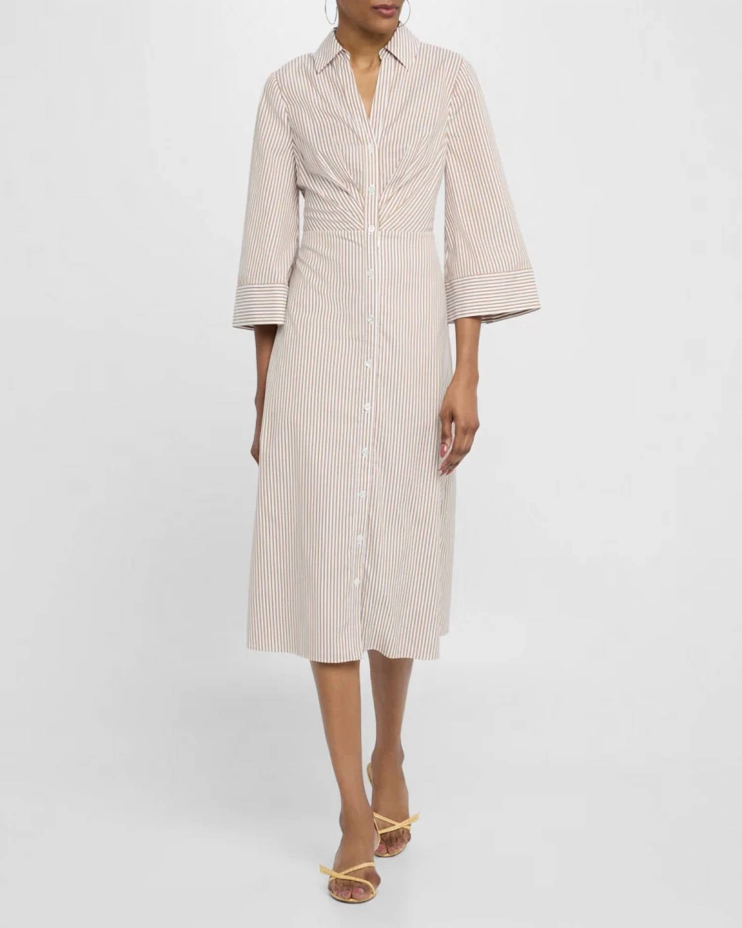 Платье миди настолько универсально, что ваши варианты его ношения безграничны. Откройте для себя платье миди Haydon от Veronica Beard - элегантный выбор для праздничной вечеринки в винтажном стиле. Платье с рукавами три четверти и облегающим силуэтом футляр отличается присборенным лифом, классическим заостренным воротником и V-образным вырезом. Платье выполнено из чистого хлопка в шикарную полоску и застегивается на пуговицы. Подол элегантно опускается ниже колена, придавая ему изысканный вид. Платье импортируется из-за гарантируемого качества. Уход: химчистка.