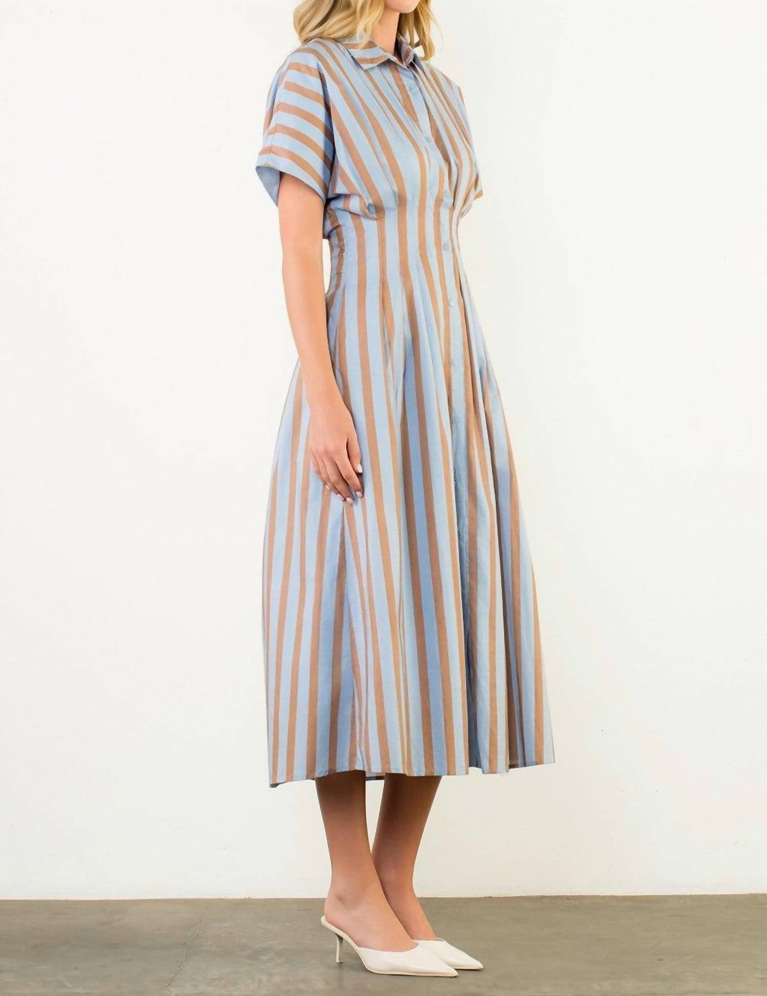Просто добавьте шлепанцы или мюли, и все готово. Платье-миди Cora Striped от THML - минималистичный шедевр, идеально подходящий для весеннего сезона и создающий шикарный акцент на любой годовщине. Это платье-рубашка с короткими рукавами и воротником-стойкой застегивается на пуговицы для удобства и стиля. Элегантный полосатый узор синего цвета добавляет нотку изысканности, а карманы - практичный элемент. Это платье, родом из неизвестной страны, станет универсальным предметом гардероба, который легко перейдет от повседневных прогулок до особых случаев.