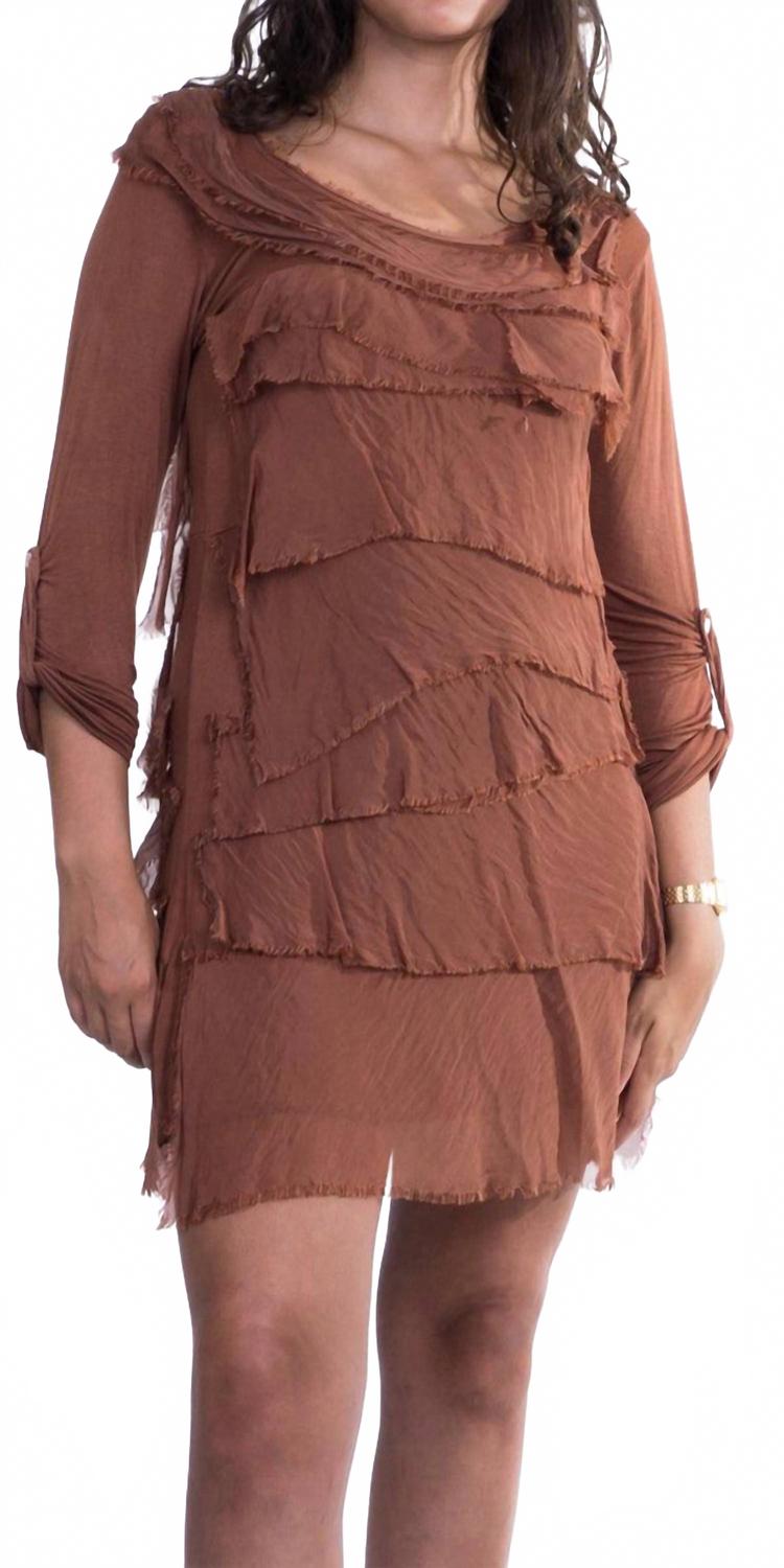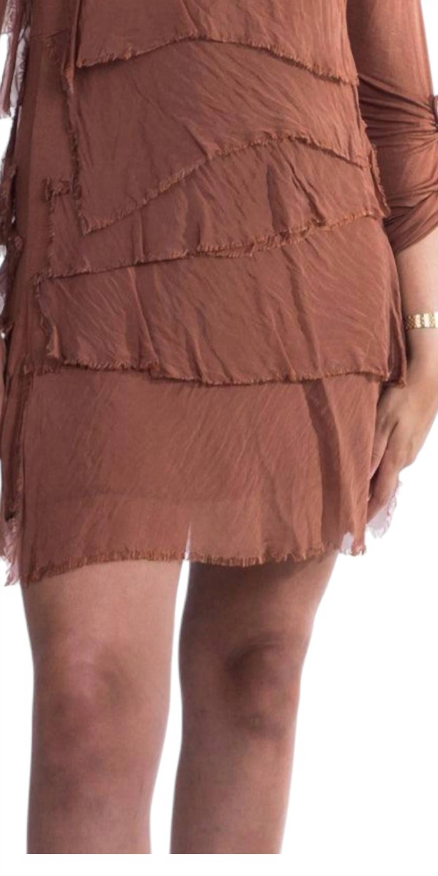 Идеальное мини-платье для теплых месяцев. Представляем мини-платье Siena Sleeve Ruffled от GIGI MODA - великолепный вариант для вашей следующей коктейльной вечеринки. Это платье цвета ржавчины с длинными рукавами, застежкой на пуговицы и глубоким овальным вырезом горловины воплощает собой тренд на сдержанную роскошь. Это фактурное платье-трапеция, изготовленное в Италии из 100% шелка, обеспечивает непринужденную элегантность благодаря застежке-липучке. Для поддержания превосходного качества этого прекрасного изделия просто сдайте его в химчистку.