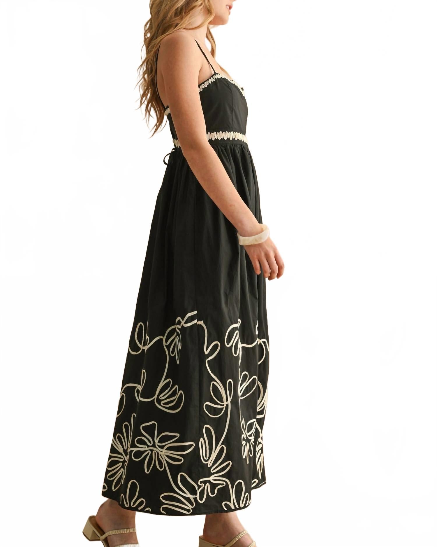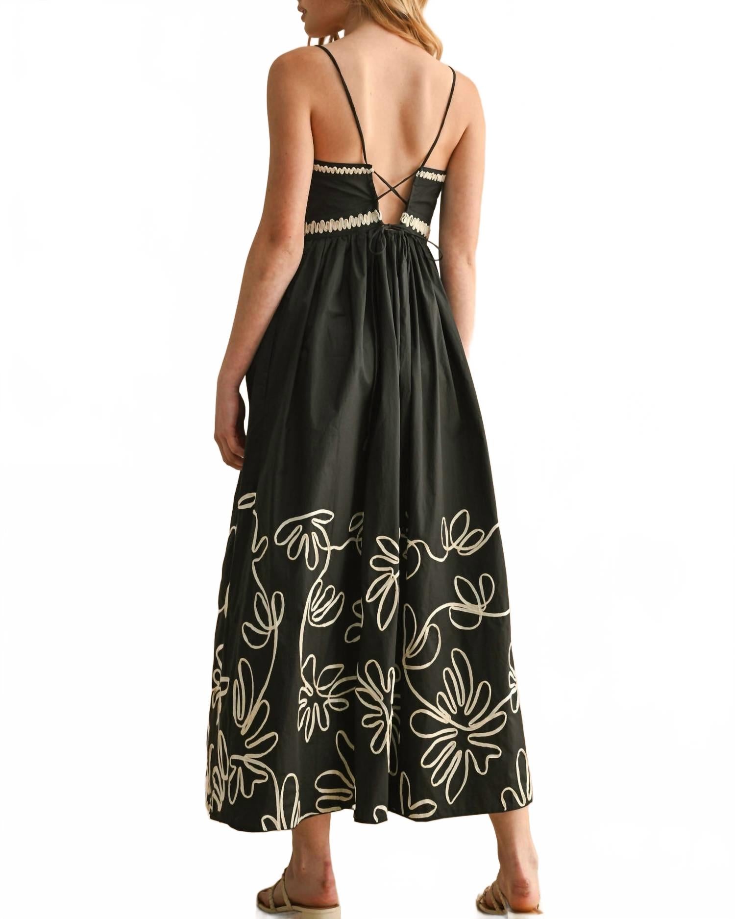 Платье миди настолько универсально, что варианты его ношения безграничны. Представляем платье миди с вышивкой и нашивками от MIOU MUSE - очаровательное изделие шикарного черного цвета, идеально подходящее для солнечных летних дней. Это платье на тонких бретельках и с яркой цветочной вышивкой на элегантном А-силуэте создает стильный образ бохо-шик. Платье изготовлено из дышащего хлопка, имеет удобную завязку и легко поддается машинной стирке. Идеально подходит для пасхальных каникул или любого особого случая, когда вы хотите выделиться.