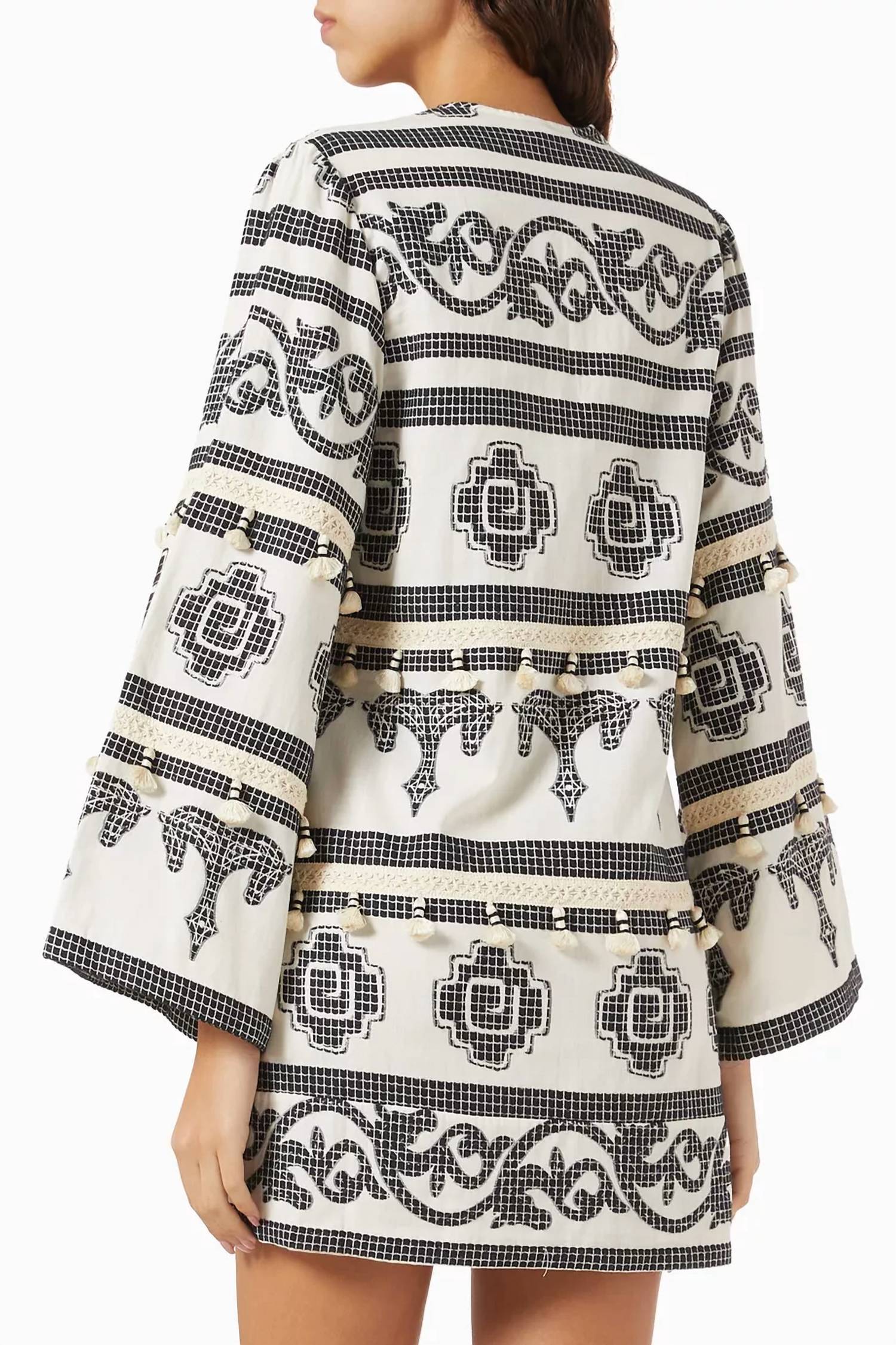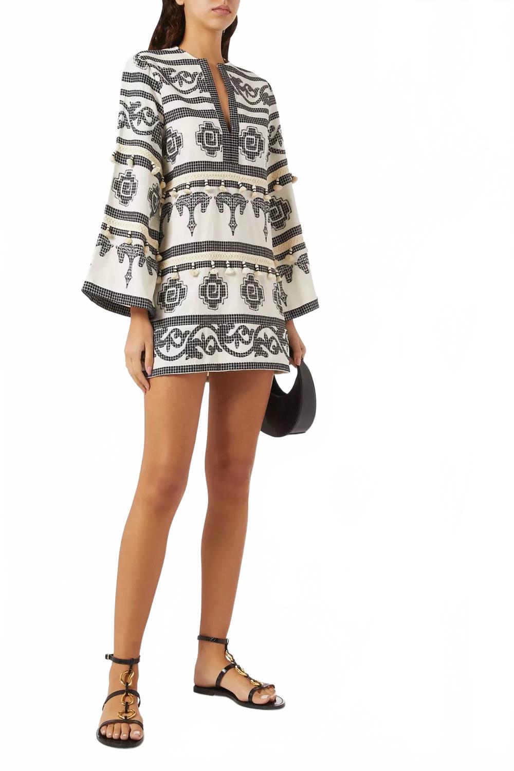 Идеальное мини-платье для теплых месяцев. Оцените элегантность платья Temple Mini Dress от Johanna Ortiz - туники в шикарной экрю-черной расцветке. Это платье с длинными рукавами и узором из вышитого хлопка, замысловатыми узорами и вышитыми кисточками идеально подходит для образа в стиле бохо-шик. Состав: 100% хлопок. Застежка: на застежке. Это универсальное платье, созданное для того, чтобы дополнить ваш гардероб для праздника этой весной, может стать отличным вариантом как для пляжного отдыха, так и для элегантного дневного наряда.