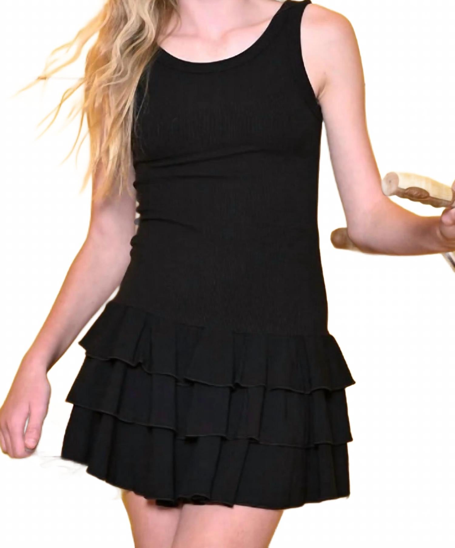 Комфортное и элегантное платье, которое вы будете носить круглый год. Представляем платье Tween Brielle Tank Ruffle Dress от Katie J NYC - стильный и удобный вариант для летних случаев. Это мини-платье черного цвета без рукавов с игривой юбкой с оборками и облегающим кроем, подчеркивающим фигуру. Изготовленное из мягкой смеси 95% вискозы и 5% спандекса, оно обеспечивает непринужденный стиль благодаря минималистичному однотонному узору и круглому вырезу. Застежка: надевать. Уход: ручная стирка и сушка на горизонтальной поверхности.
