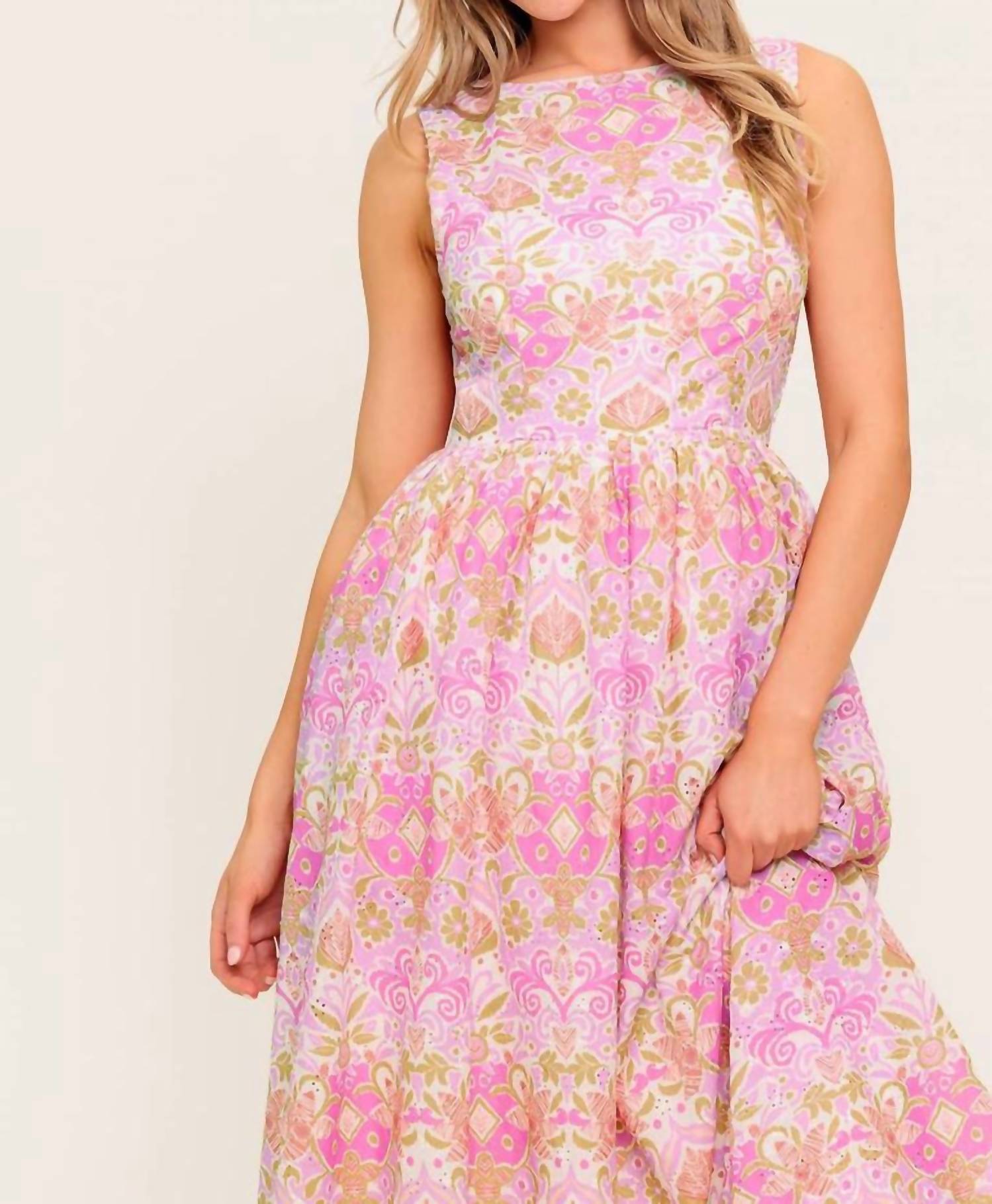 Платье миди настолько универсально, что варианты его ношения безграничны. Встречайте платье миди Under The Sun Woven от FLYING TOMATO - очаровательное дополнение к вашему весеннему гардеробу. Это платье без рукавов с широким вырезом и пышной юбкой выполнено в ярко-розовом цвете с очаровательным узором. Длина платья - около 125 см, оно изготовлено из 100% полиэстера и имеет удобную застежку-молнию сзади. Благодаря практичным карманам и женскому дизайну, оно не только стильное, но и функциональное. Рост модели - 178 см, размер S.