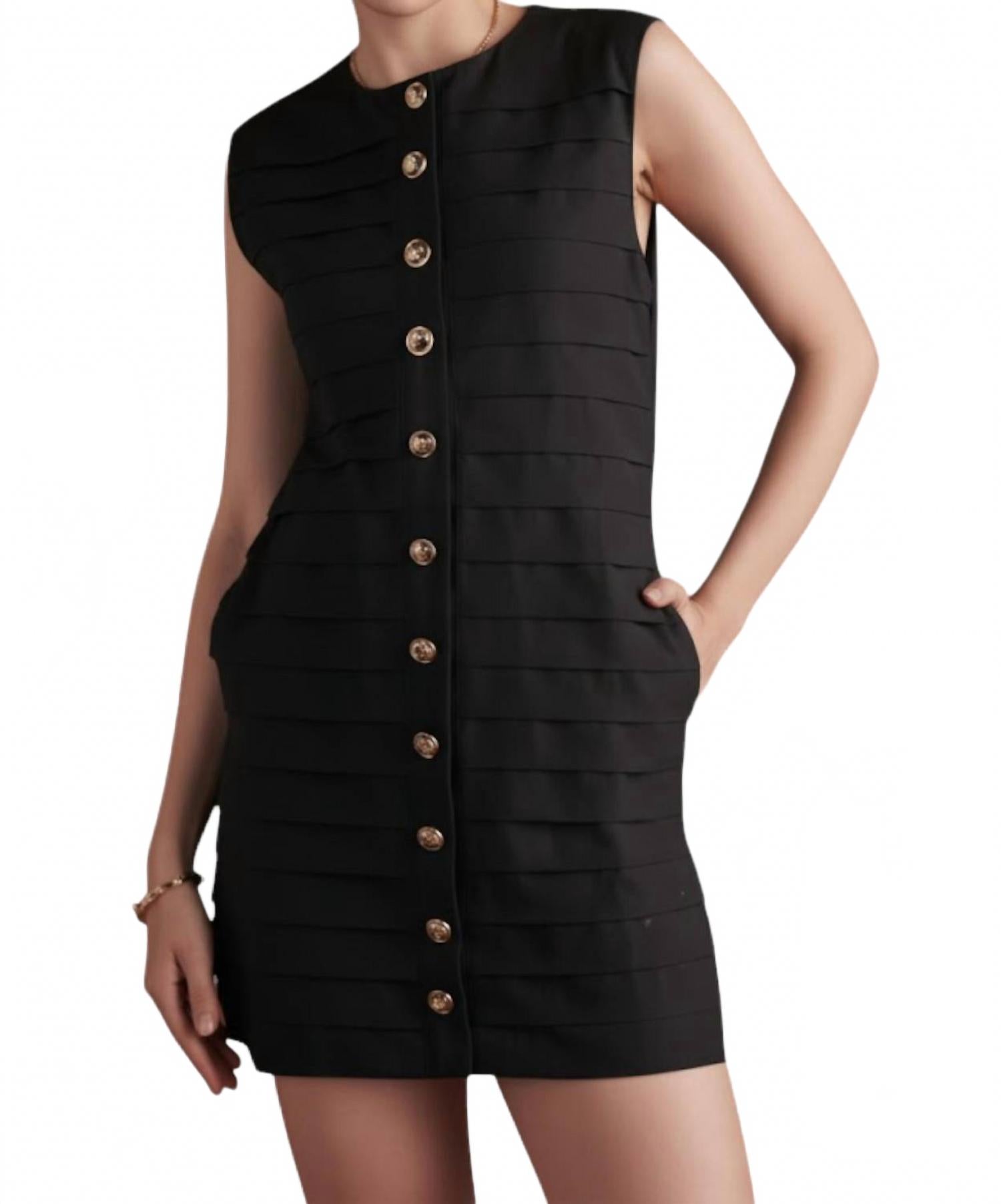 Короткое и воздушное платье для теплых дней. Раскройте в себе модницу с мини-платьем Ruffle Me Wild от Strut & Bolt, созданным для элегантных званых ужинов или спокойного роскошного летнего отдыха. Это платье без рукавов классического черного цвета, облегающего силуэта и круглого выреза, идеально дополнит ваш элегантный образ. Застежка на пуговицы и удобные карманы делают его одновременно функциональным и стильным. Уход за ним прост: достаточно машинной стирки, и оно станет отличным дополнением к вашему гардеробу.