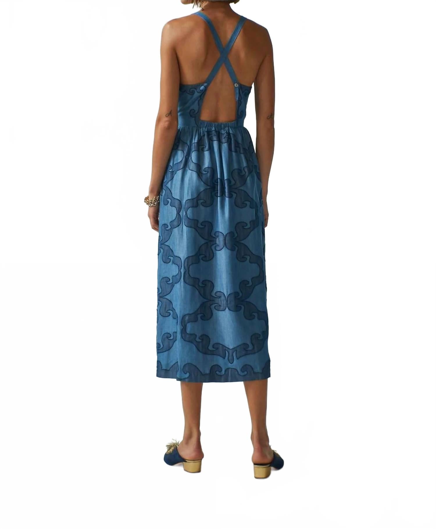 Просто добавьте шлепанцы или мюли, и все готово. Представляем женское платье Della от CAROLINA K - стильное и легкое дополнение к вашему летнему гардеробу. Это платье без рукавов длиной миди выполнено из 100% тенсель-денима. Лиф украшен изысканной темно-синей вышивкой, а присборенная юбка создает ощущение бохо-стиля. Овальный вырез и стильная открытая спина создают женственный силуэт «комбинация». Эластичный пояс обеспечивает идеальную посадку и легко надевается, создавая идеальный образ для отпуска.