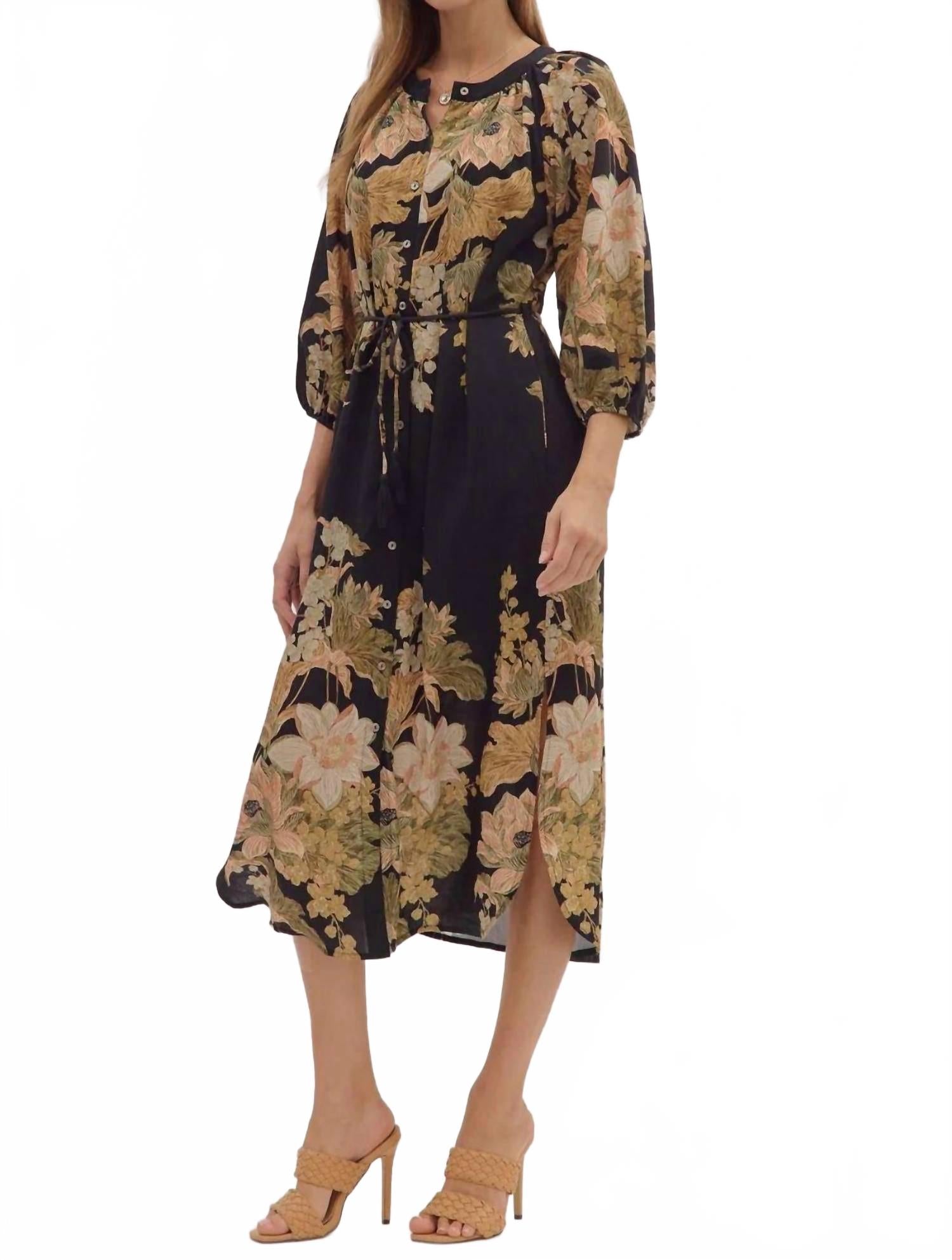 Платье идеальной длины существует. Представляем платье миди Maddy от Entro - незаменимая вещь в вашем весеннем гардеробе благодаря элегантному цветочному принту. Это черное платье-футляр с длинными рукавами три четверти и регулируемой талией на шнурке, подчеркивающей фигуру. Платье изготовлено из легкого нейлона (83% вискозы и 17% нейлона) и отличается продуманными деталями, такими как эластичные манжеты на рукавах и удобные боковые карманы. Застежка: пуговицы. Уход: машинная стирка.