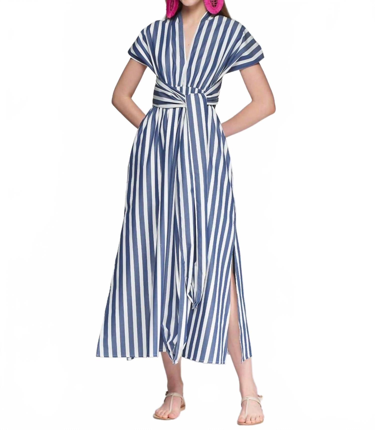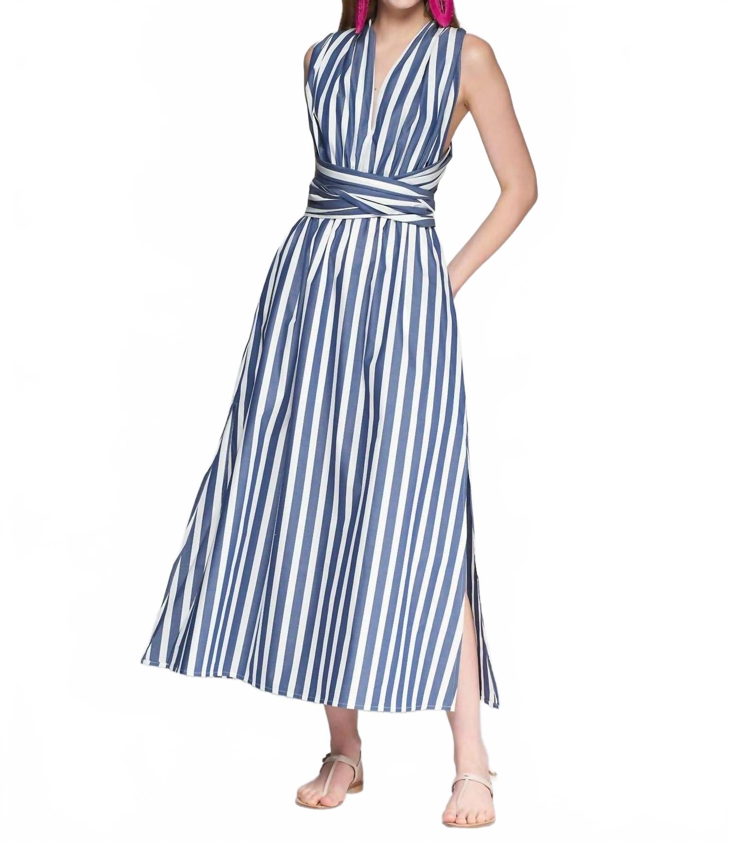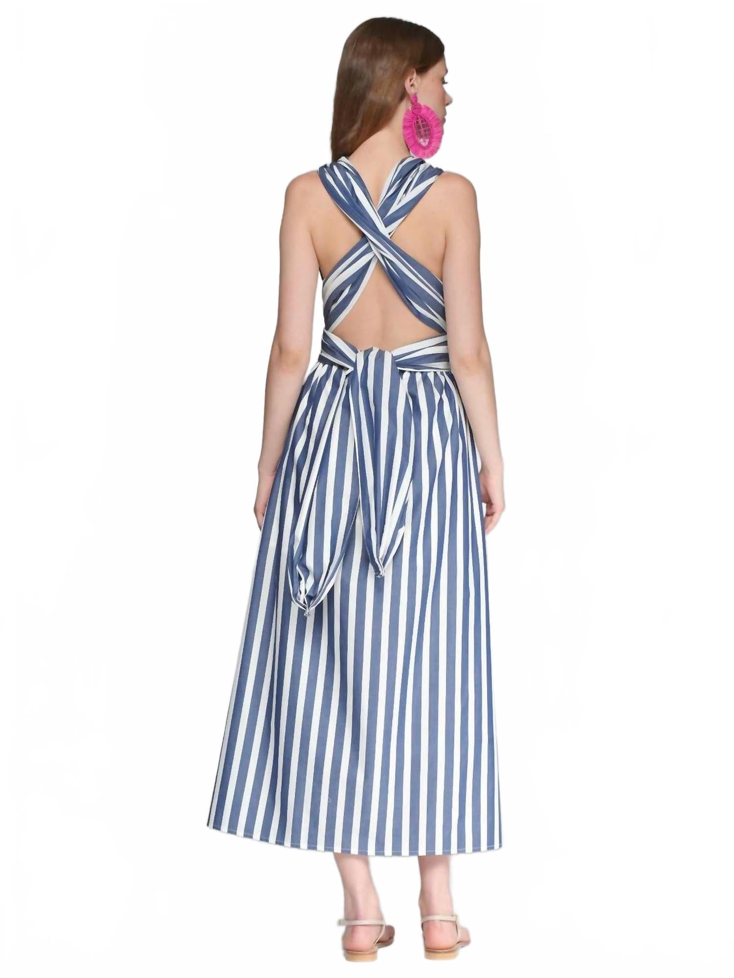 Откройте для себя стильное платье-трансформер Cruz от Vilagallo - облегающее платье без рукавов с расклешенным кроем, идеально подходящее для вашего летнего гардероба. Это платье в сине-белую полоску из 100% хлопка отличается универсальным V-образным вырезом, который можно носить как спереди, так и сзади различными способами. Благодаря удобному крою, оно легко надевается и становится незаменимой минималистичной вещью для любого случая.