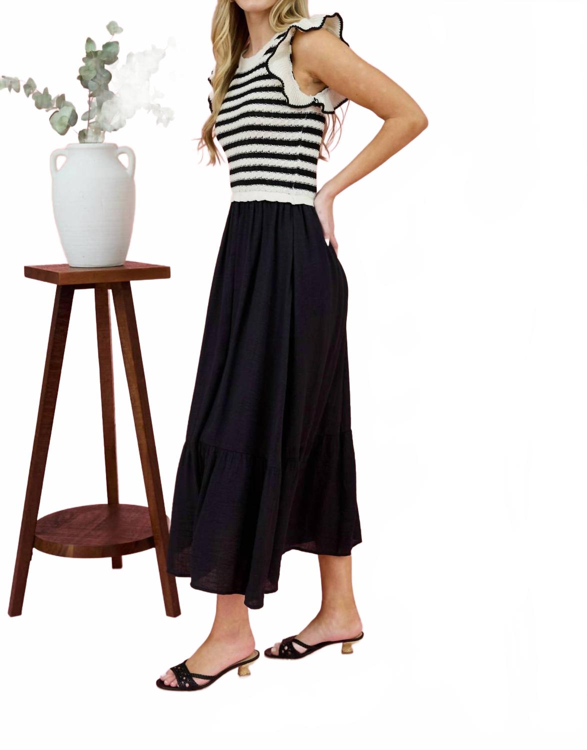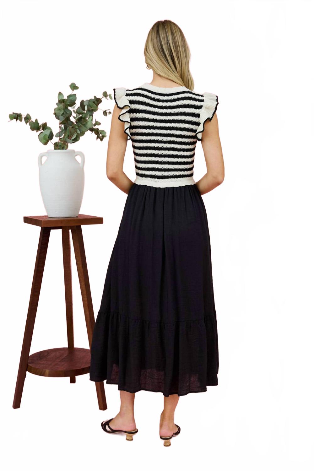 Представляем платье Lola Stripe Twofer Dress от Blu Pepper - стильный выбор для отпуска в монохромной темно-синей цветовой гамме. Это платье миди А-силуэта с короткими рукавами и игривой оборкой по подолу сочетает в себе полосатый трикотажный верх и однотонный низ. Состав: 100% полиэстер (основа и подкладка), 86% вискозы и 14% нейлона, что обеспечивает комфортную и элегантную посадку.