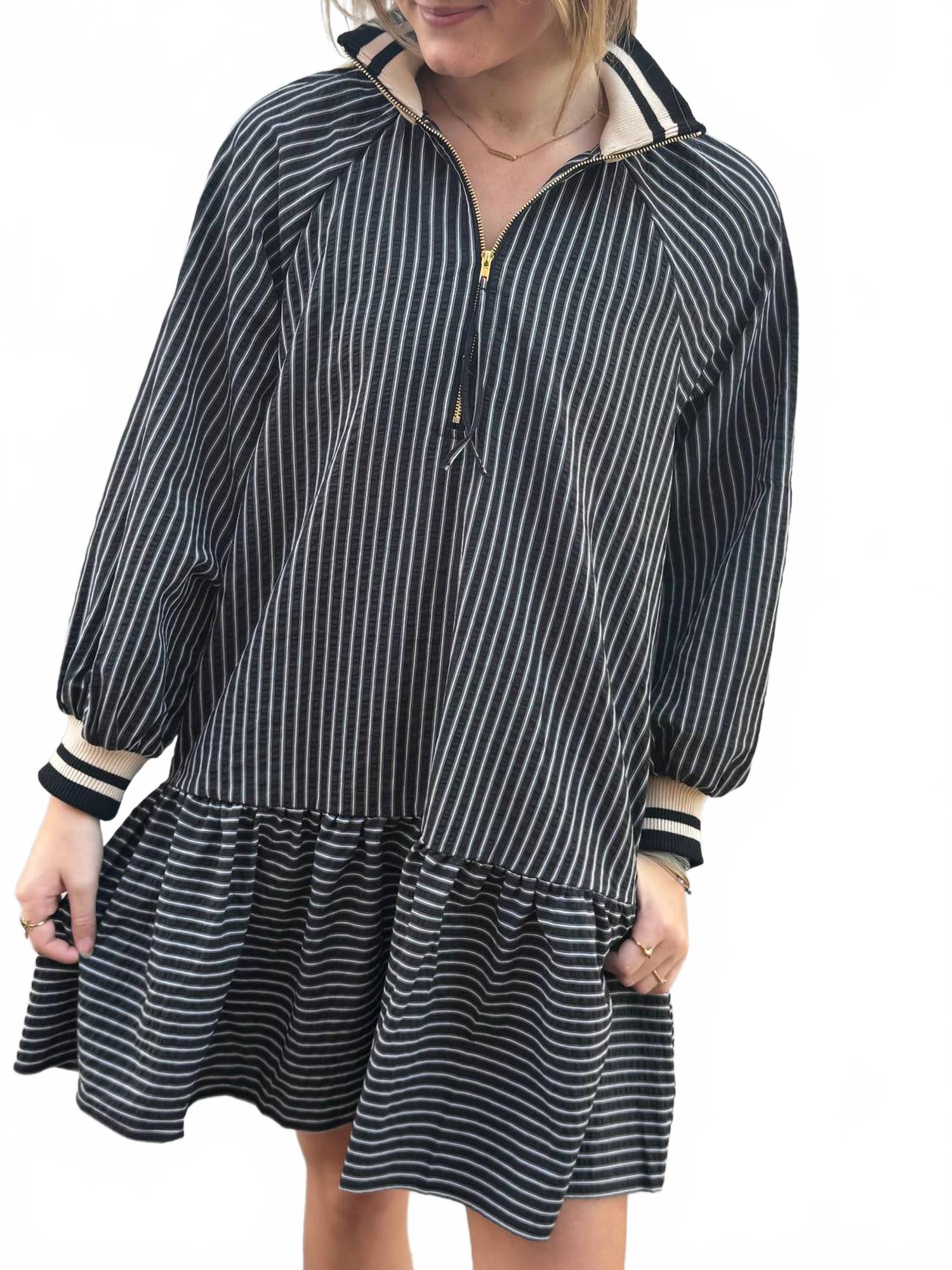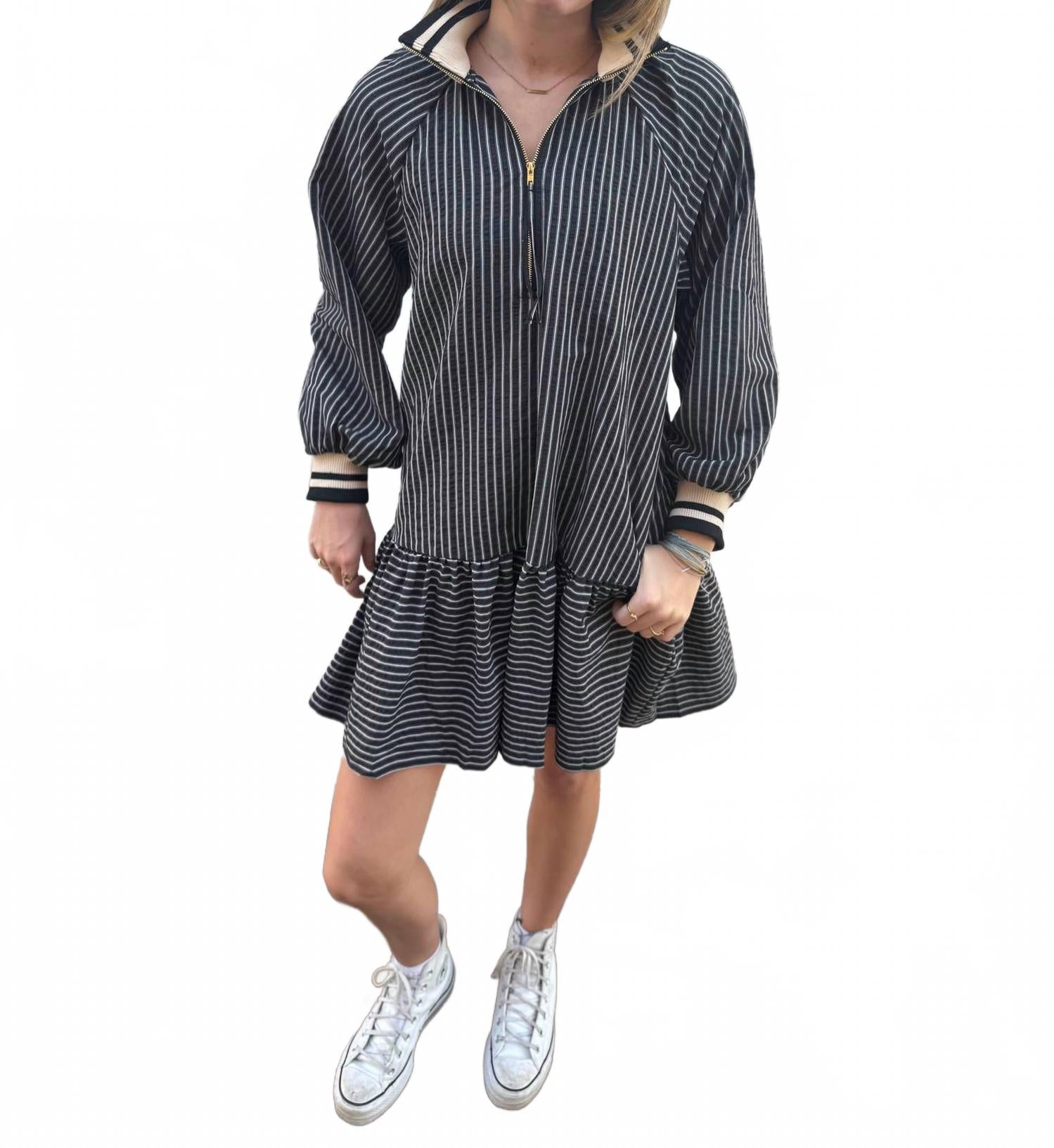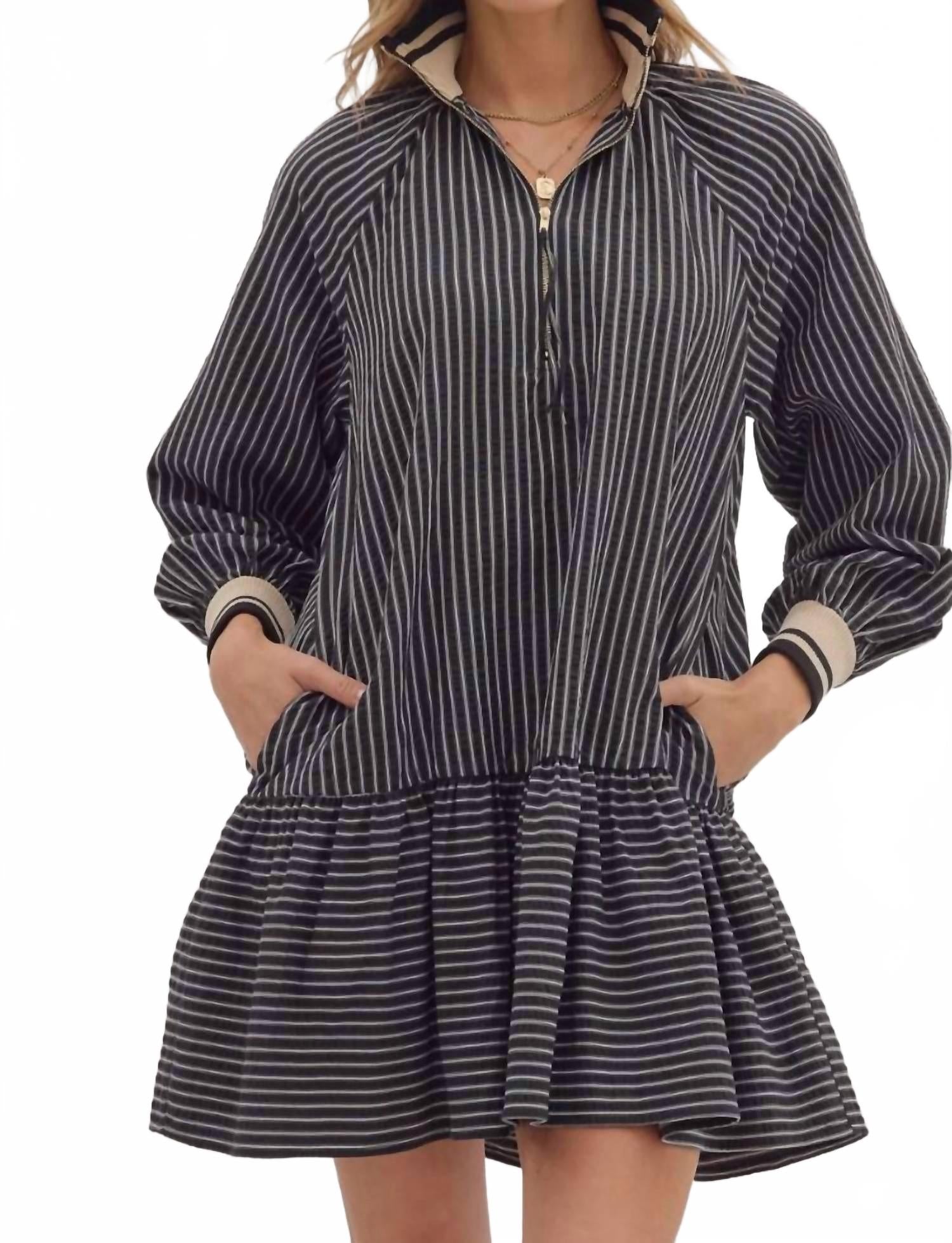 Идеальное мини-платье для теплых месяцев. Представляем мини-платье Margorie Striped от Entro - шикарный А-силуэт, идеальный для летних путешествий. Это платье темно-синего цвета из теплой хлопковой ткани с длинными рукавами и стильным ребристым воротником дополнено удобной застежкой-молнией спереди. Благодаря боковым карманам и ребристым манжетам, оно практичное и модное. Состав: 50% хлопок, 50% полиэстер. Уход: машинная стирка и сушка в стиральной машине.
