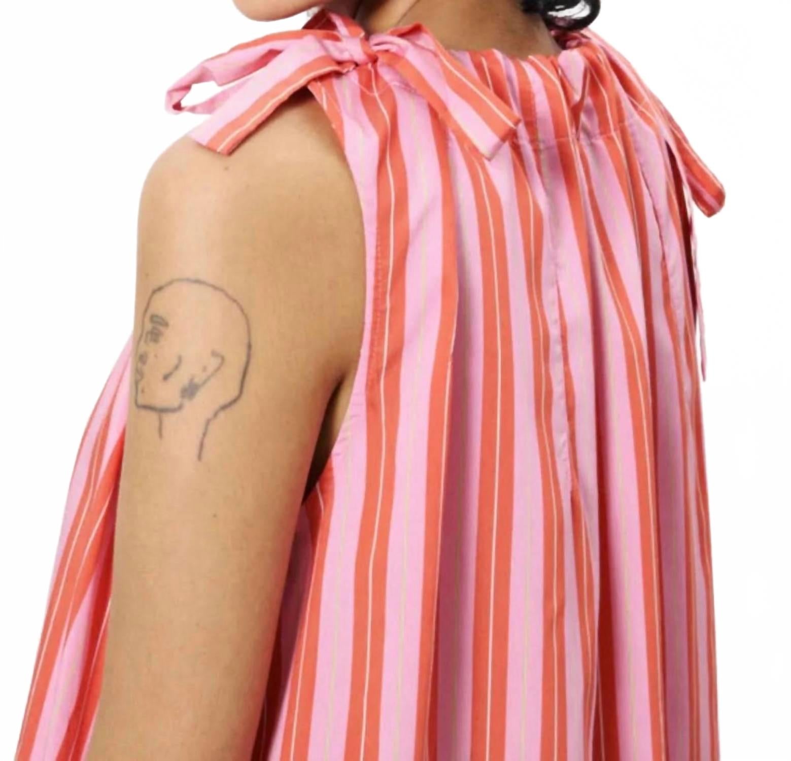 Комфортное и элегантное платье, которое вы будете носить круглый год. Представляем платье Aelia от FRNCH - шикарный облегающий силуэт, идеально подходящий для летнего отдыха. Это мини-платье без рукавов выполнено в стильном полосатом розовом цвете с изысканным воротником-стойкой. Застежка - надевается вручную. Уход - машинная стирка и сушка на веревке.